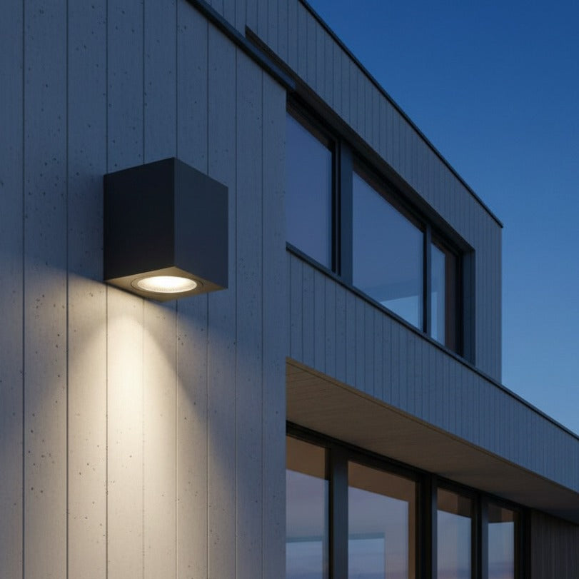 Aplica IP44 cu Dulie 1×GU10 Neagră Pătrată – 8.1 cm este o soluție modernă și compactă pentru iluminatul exterior sau interior protejat. Designul său pătrat, cu finisaj negru / gri închis, oferă un aspect minimalist și arhitectural, fiind ideal pentru fațade, terase, balcoane sau holuri. Lumina orientată în jos creează un efect discret și elegant pe perete.