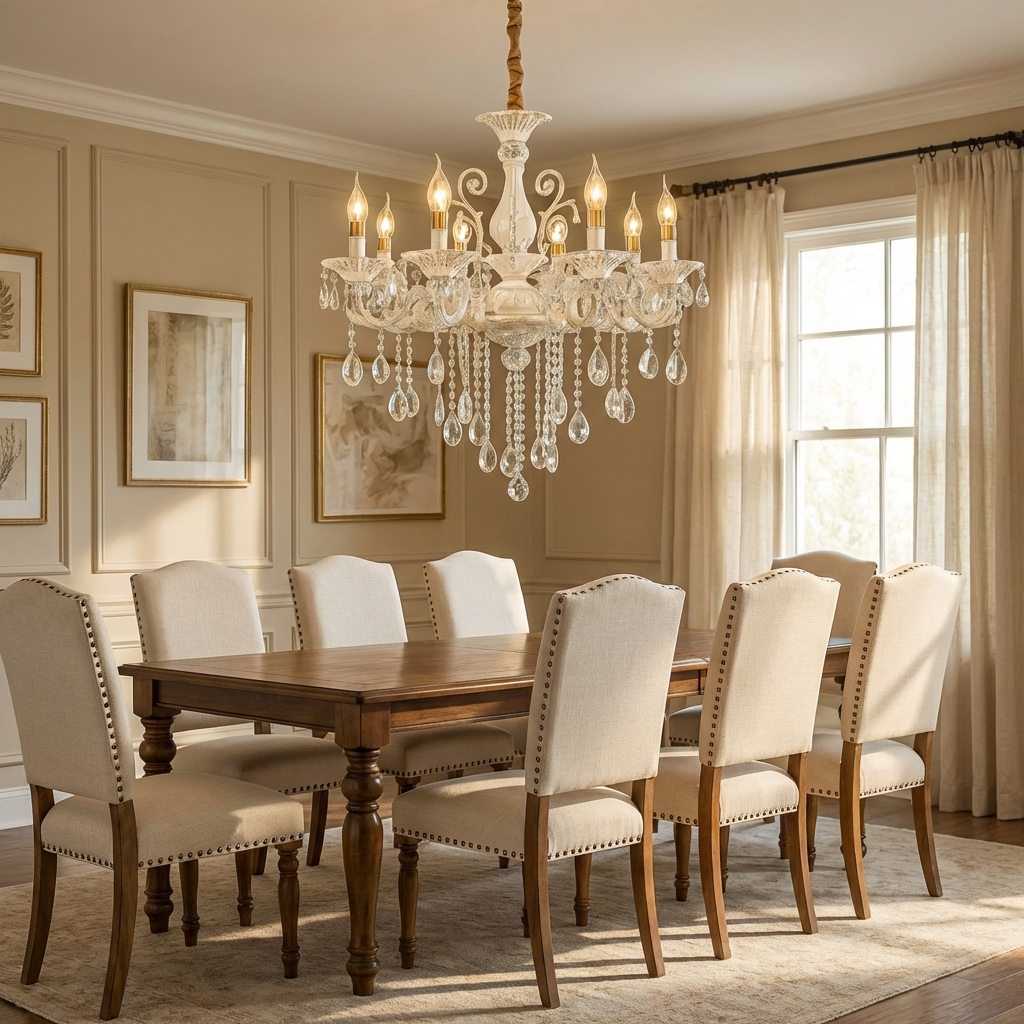Inaltimea ajustabila la montaj permite integrarea corecta in functie de inaltimea tavanului si de proportiile incaperii. Isabelle White 8xE14 se remarca prin eleganta discreta si versatilitate, devenind un element central al decorului fara a incarca vizual spatiul.