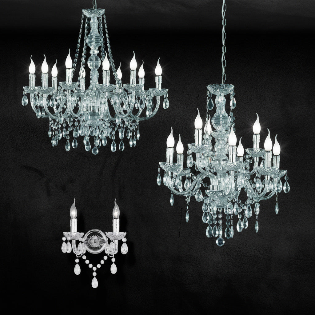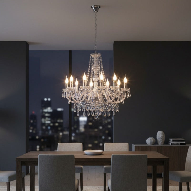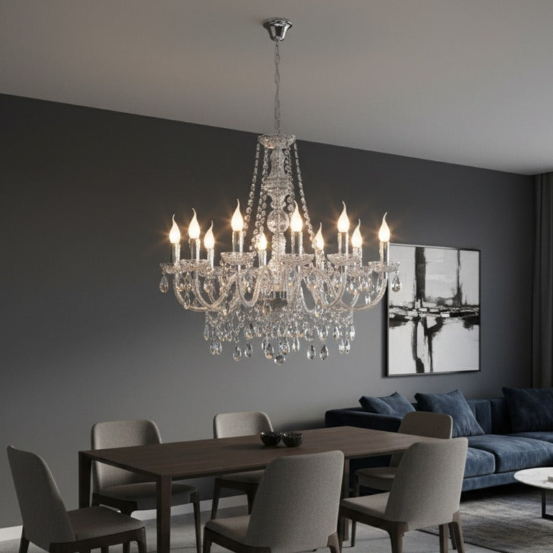 Corpul de iluminat cu 10 surse are o suspensie de 165 cm și un diametru de 76 cm. Finisajul din metal cromat și abajurul din cristal acrilic transparent se completează perfect, creând un aspect general armonios.