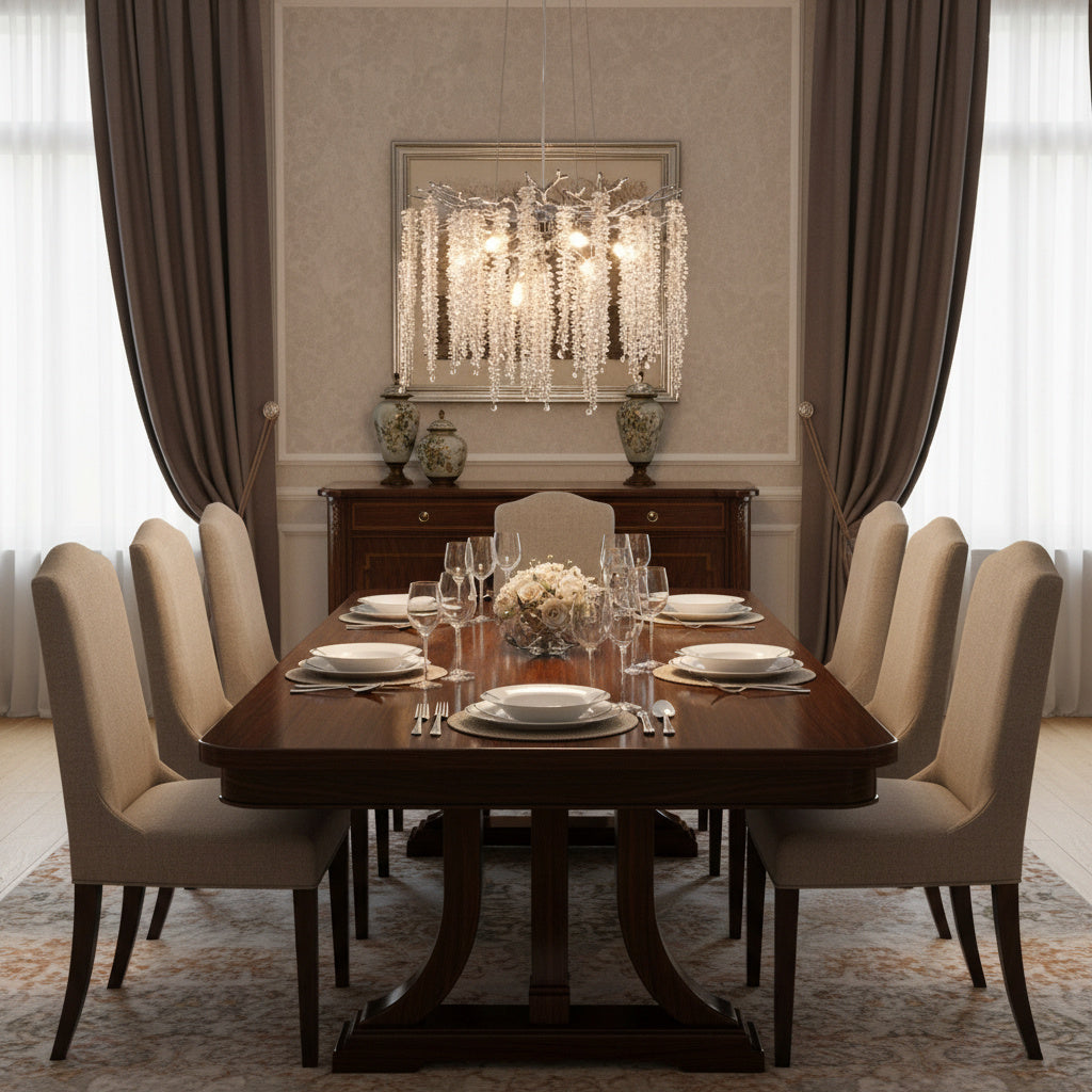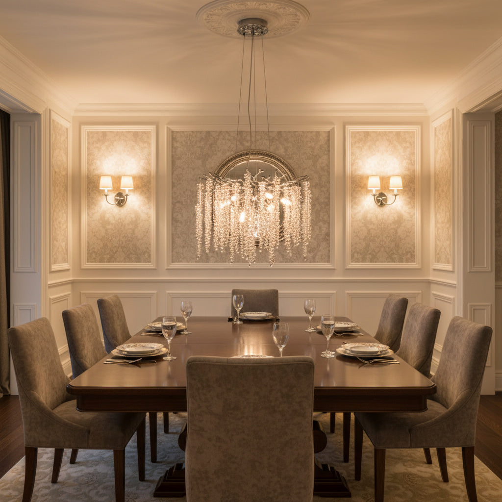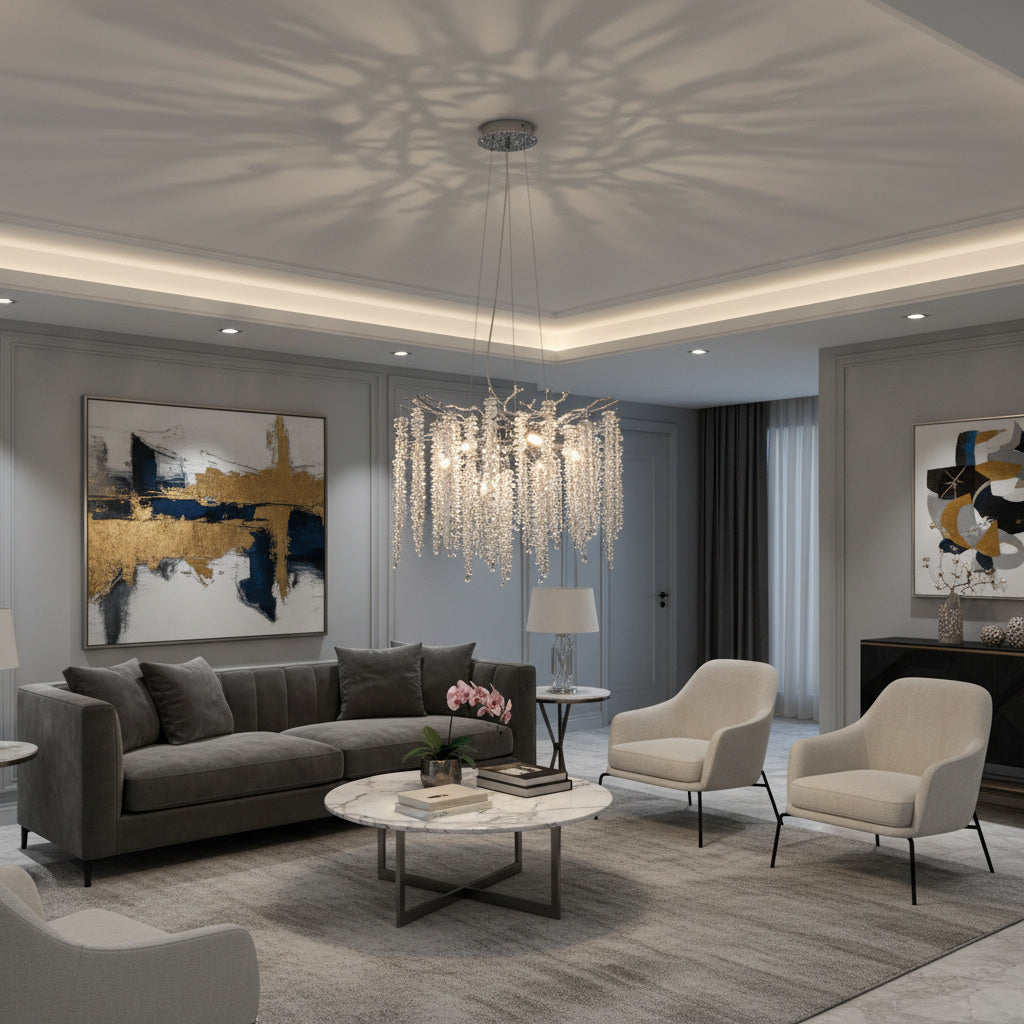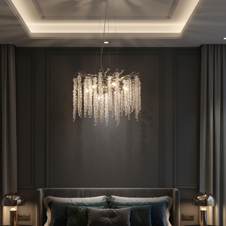 Cu un diametru de 46 cm, acest candelabru este ideal pentru livinguri, dininguri, dormitoare sau spatii comerciale elegante, unde adauga un accent luxos fara a incarca vizual incaperea. Cele 6 surse de iluminare asigura o lumina echilibrata si placuta, evidentiind frumusetea cristalelor si atmosfera sofisticata a spatiului.