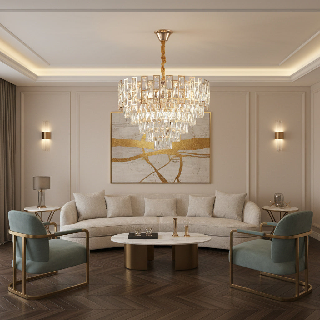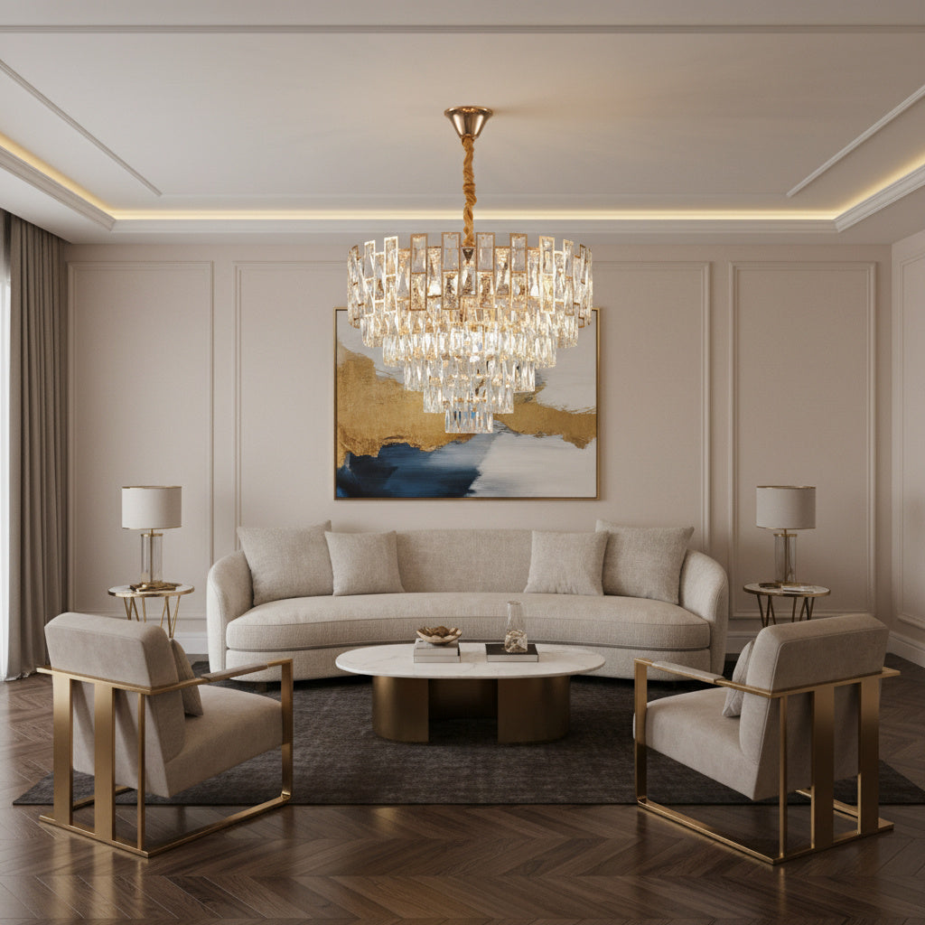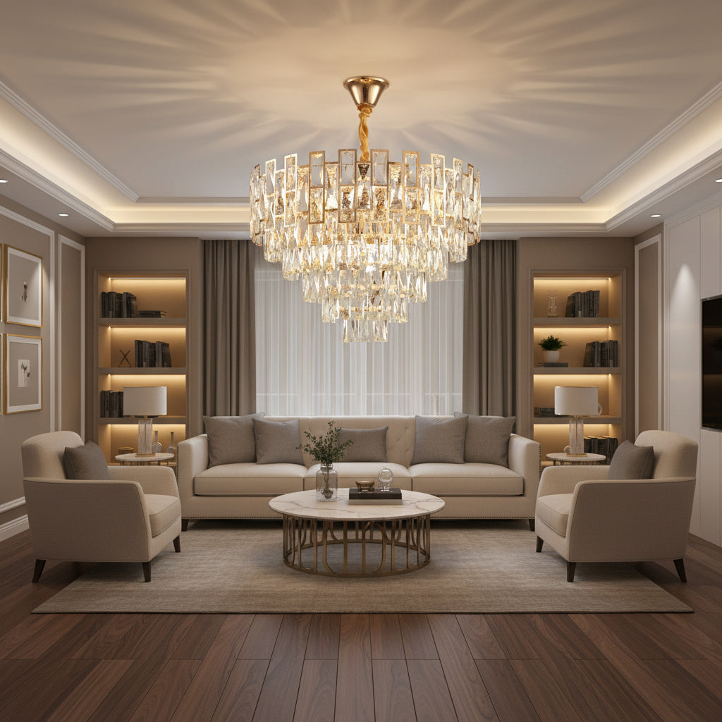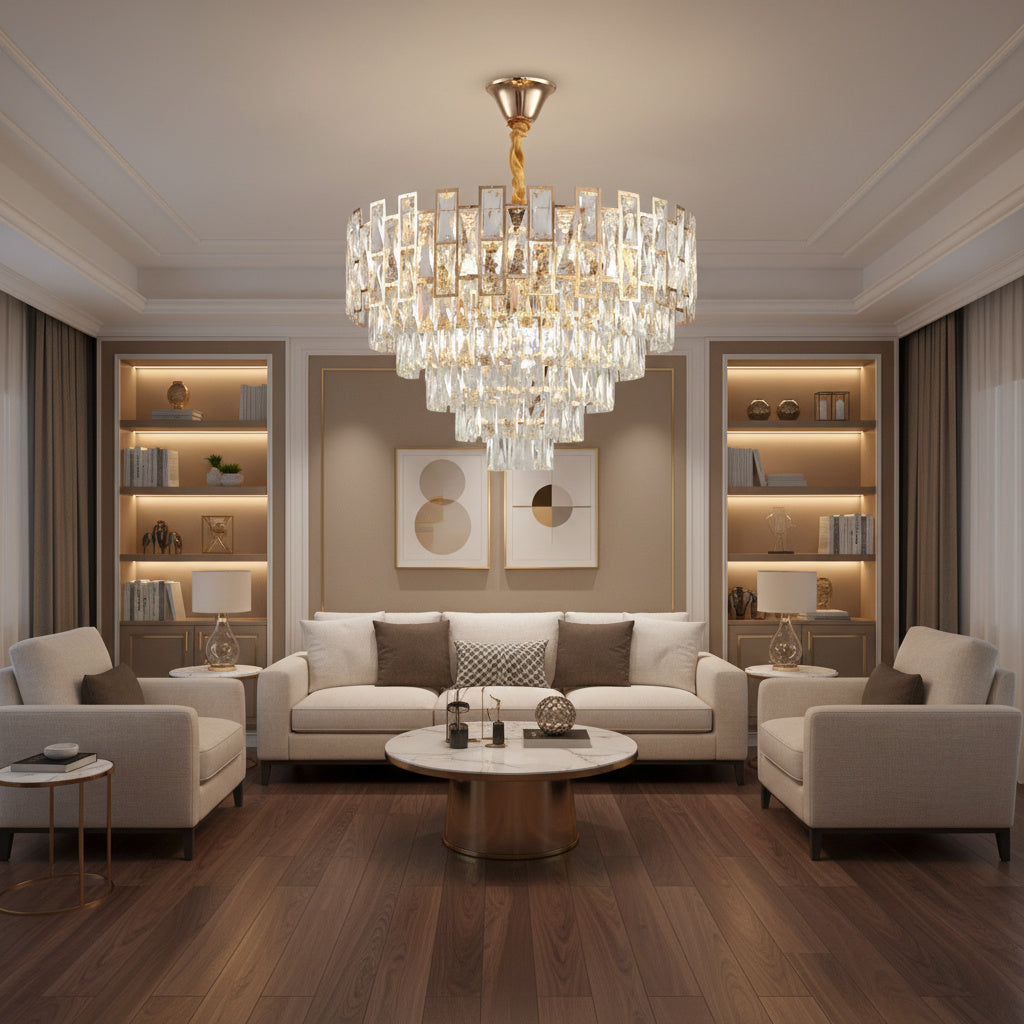 GOLDEN Valeris in varianta cu diametrul de 58 cm este un candelabru impunator, creat pentru spatii care permit o prezenta vizuala mai puternica, precum holuri generoase, livinguri sau zone de receptie. Finisajul auriu si elementele din cristal sunt atent proportionate pentru a oferi un aspect elegant si echilibrat, pastrand in acelasi timp un caracter sofisticat si atemporal. Cu o inaltime de 35 cm, acest model se integreaza armonios chiar si in interioare cu tavan de inaltime medie. Functioneaza la o tensiune de intrare de 220–240V si este echipat cu 12 socluri E14, fiecare cu o putere maxima de 40W, asigurand o iluminare eficienta si uniforma. Candelabrul nu dispune de telecomanda si beneficiaza de garantie de 2 ani, fiind certificat CE si RoHS pentru siguranta si calitate.
