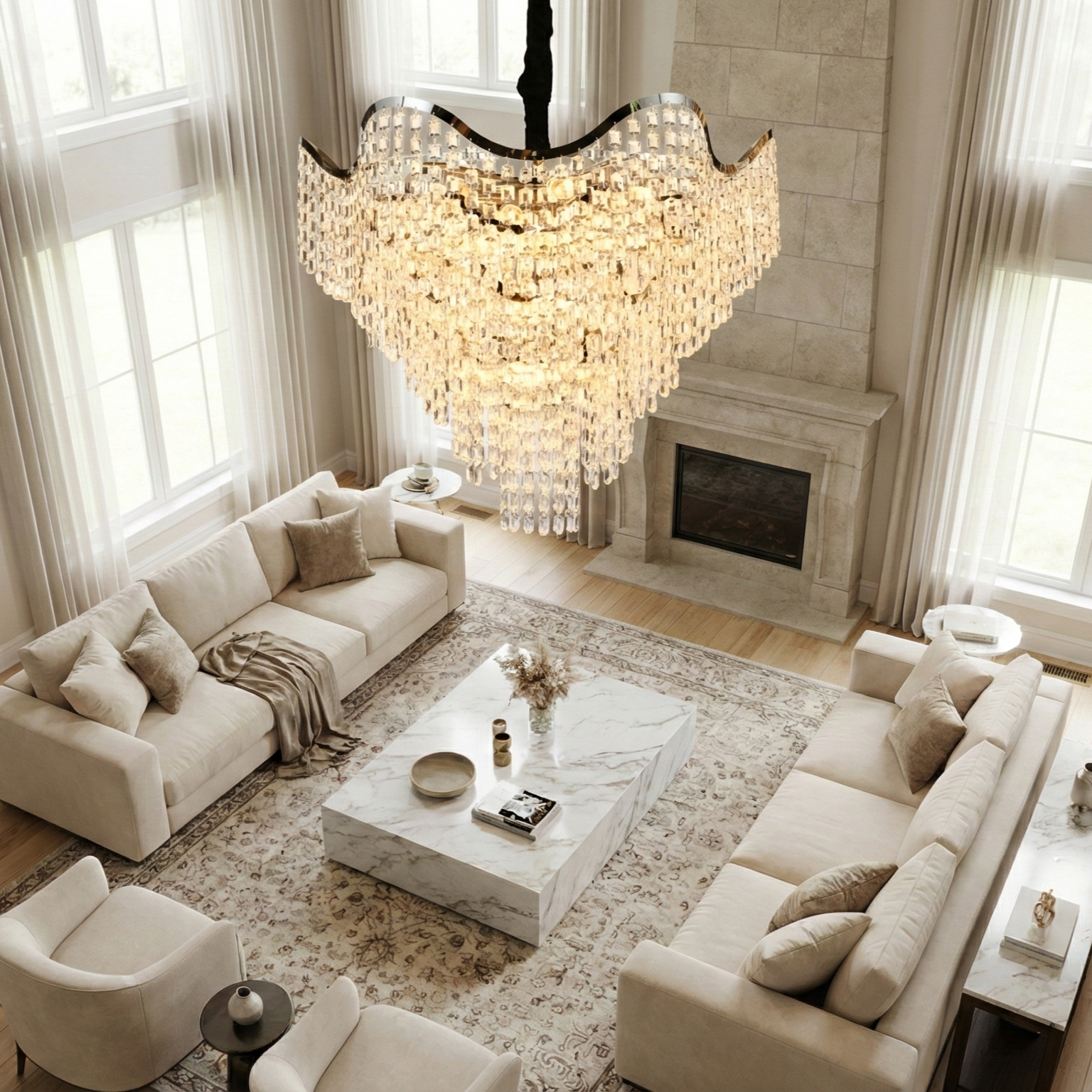 Combinația dintre finisajele premium și formele fluide transformă acest candelabru într-o piesă centrală de decor, care adaugă personalitate și eleganță oricărei case.