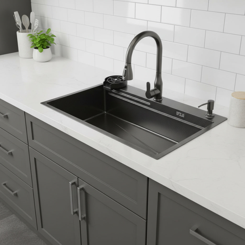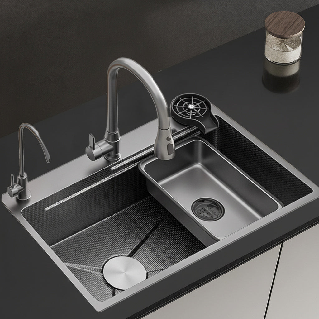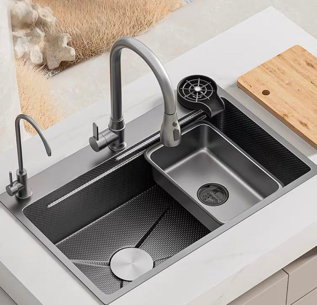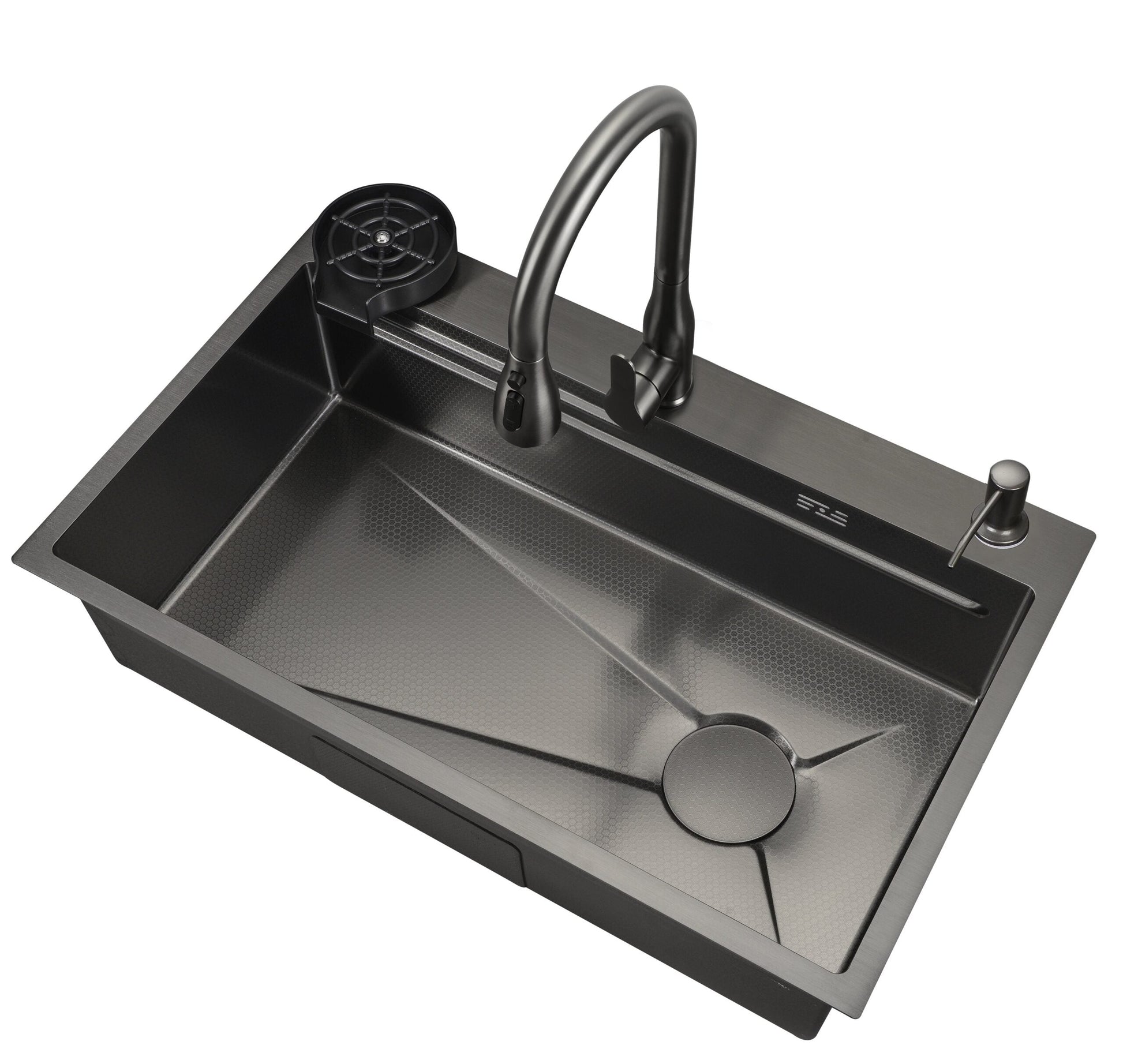 Aceasta chiuveta de bucatarie profesionala cu design multifunctional este realizata din otel inoxidabil de inalta calitate, avand un finisaj modern in nuanta de gri inchis spre negru. Dimensiunile generoase de 75x46x20 cm asigura un spatiu optim de lucru, fiind ideala pentru bucatarii moderne, atat rezidentiale, cat si profesionale.