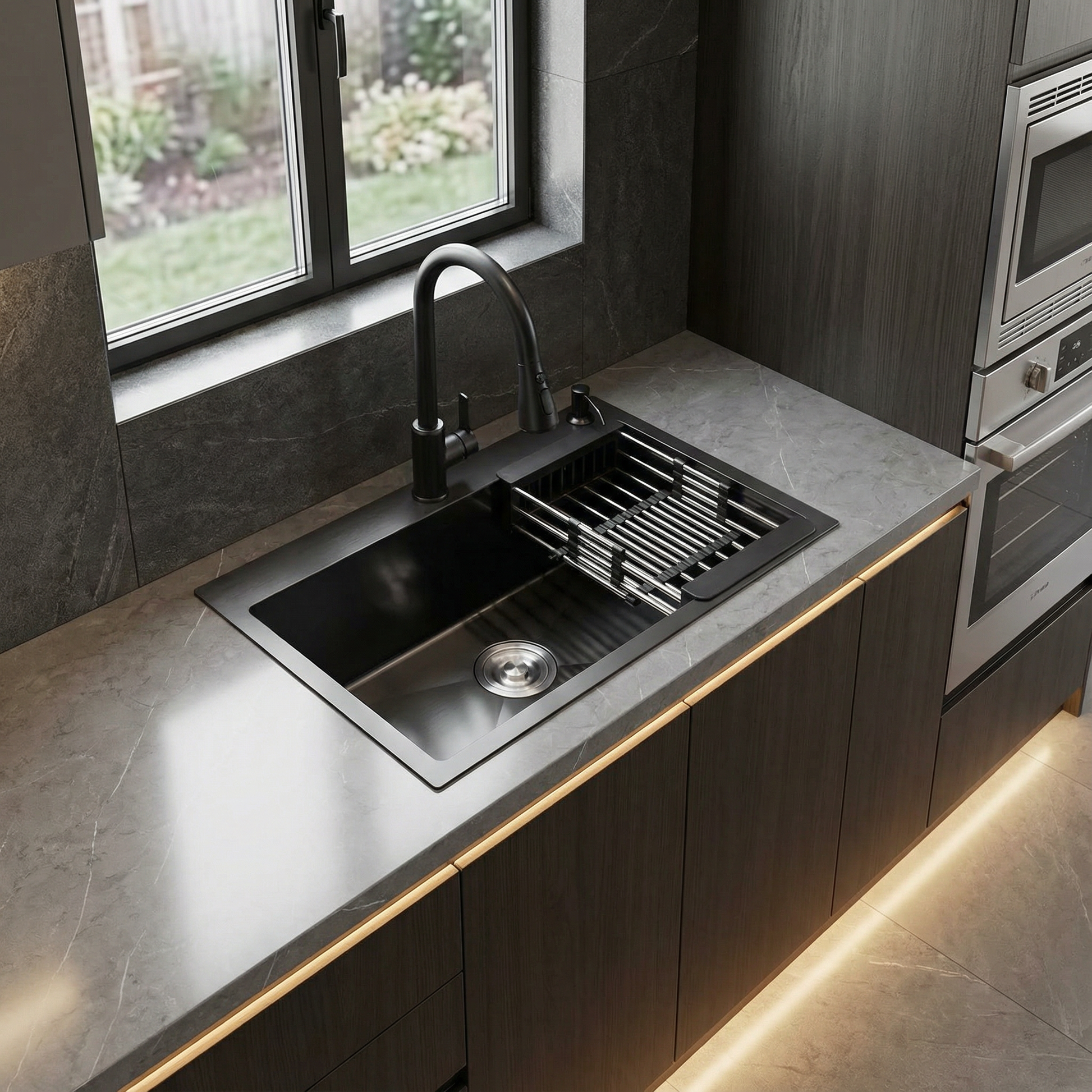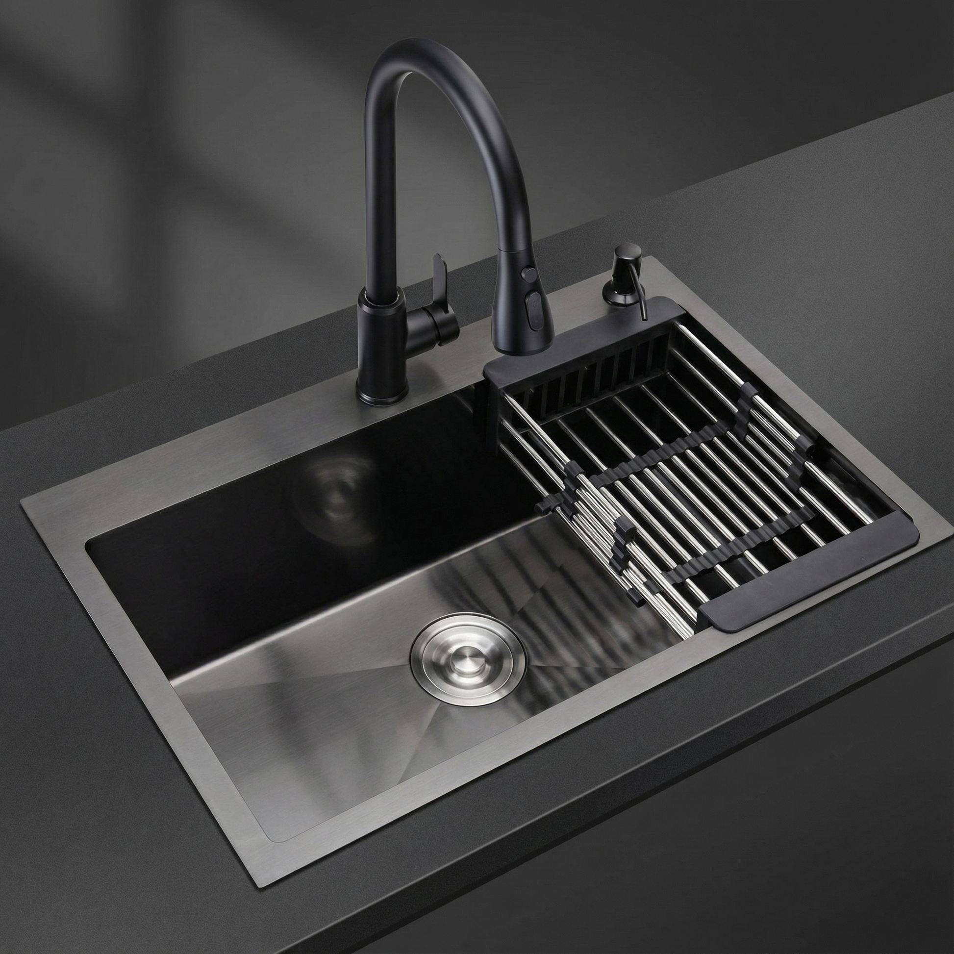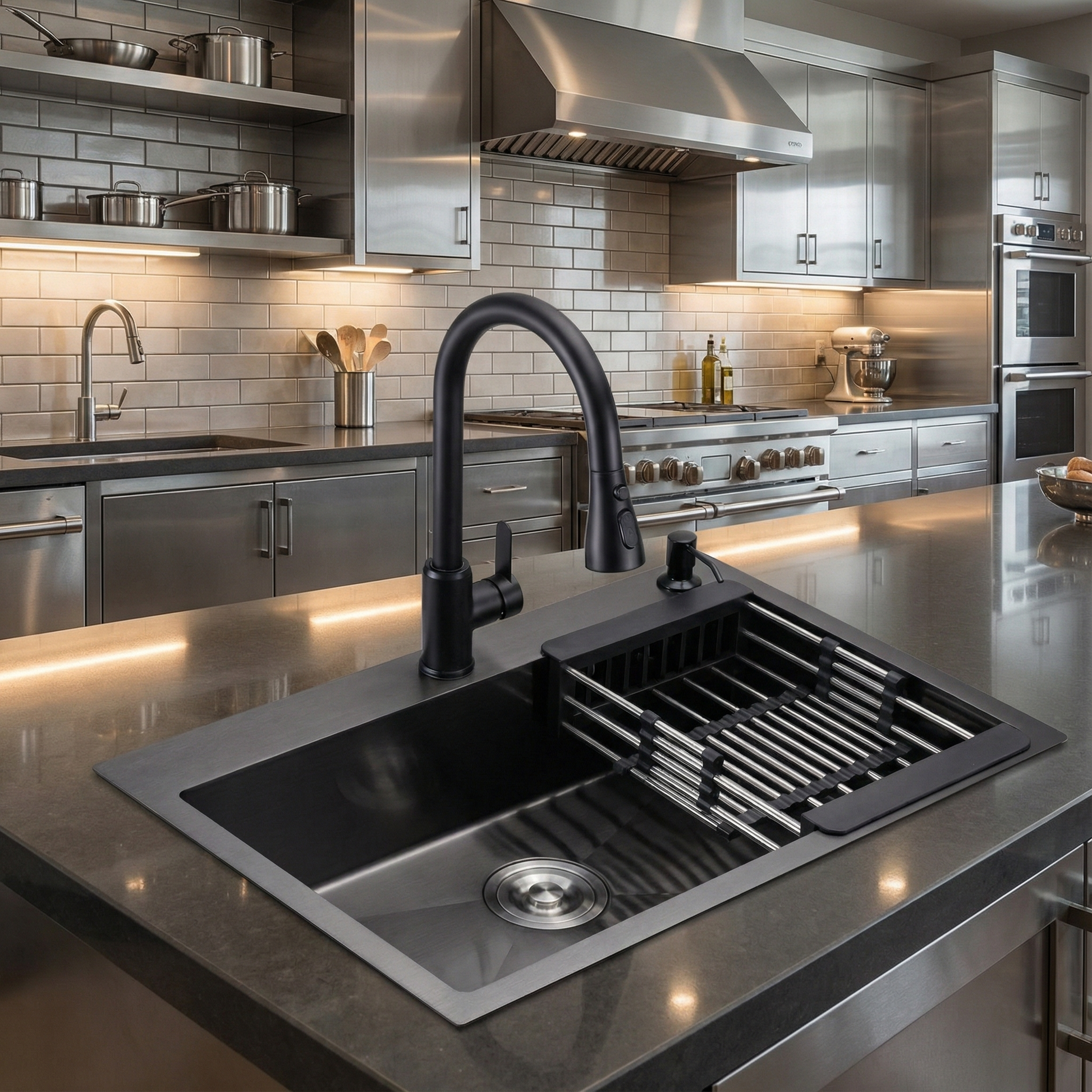 Aceasta chiuveta de bucatarie profesionala cu design multifunctional este realizata din otel inoxidabil de inalta calitate si este finisata in nuanta eleganta neagra. Dimensiunile de 68x45x19 cm ofera un echilibru ideal intre compact si functional, fiind potrivita pentru bucatarii moderne unde eficienta si designul sunt esentiale. Orificiul pentru baterie permite o instalare practica si curata.