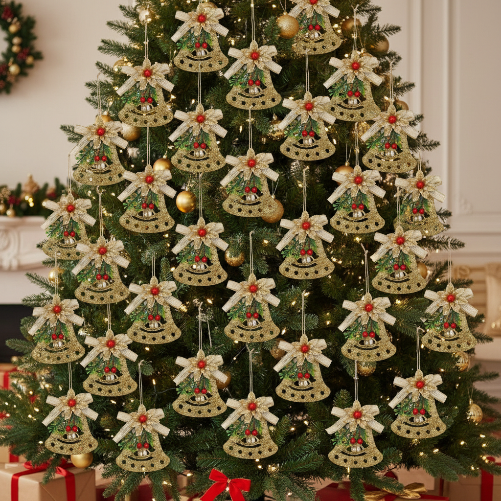 Adauga un plus de stralucire bradului tau de Craciun cu acest ornament elegant in forma de clopotel auriu. Realizat din plastic rezistent si acoperit cu sclipici fin, ornamentul este completat de un aranjament decorativ format din frunze verzi, fructe rosii si o funda aurie ce ii ofera un aspect festiv si rafinat.