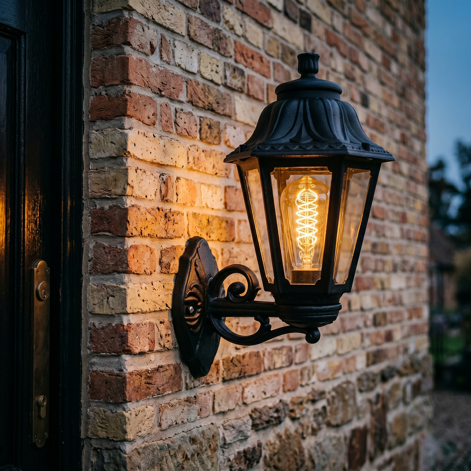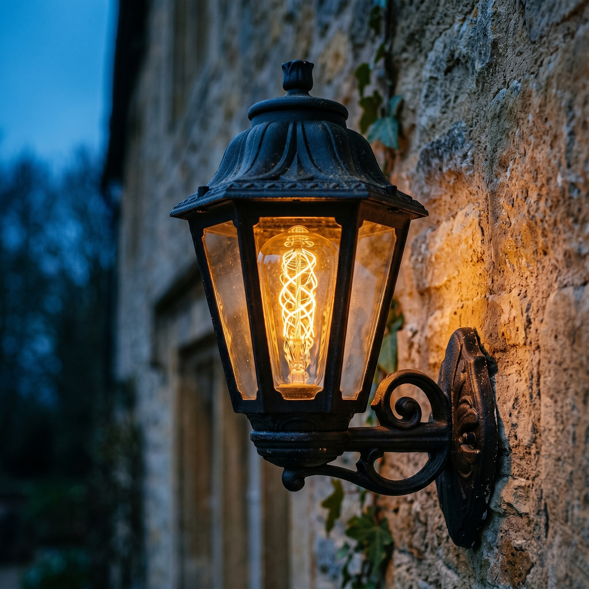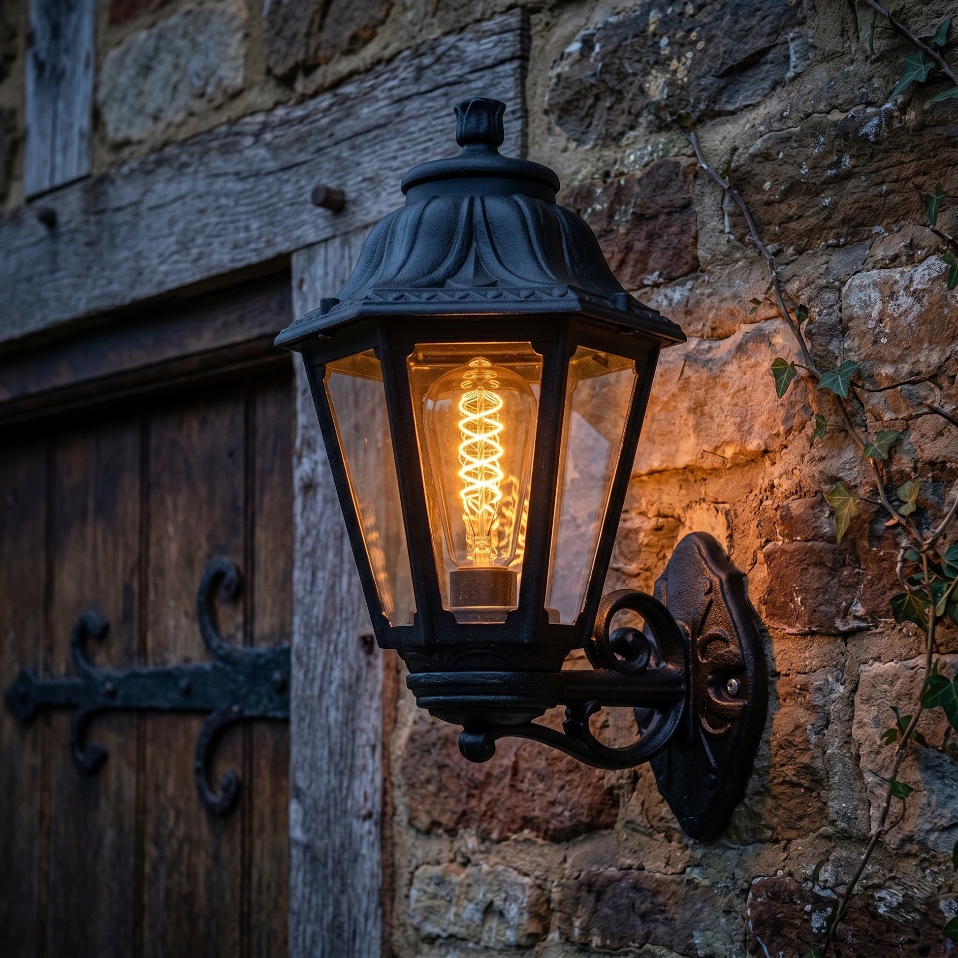 Felinar hexagonal cu fasung E27 în stil clasic, realizat din material rășinos rezistent la șocuri, stabilizat cu raze UV, fără posibilitatea de a rugini sau coroda.