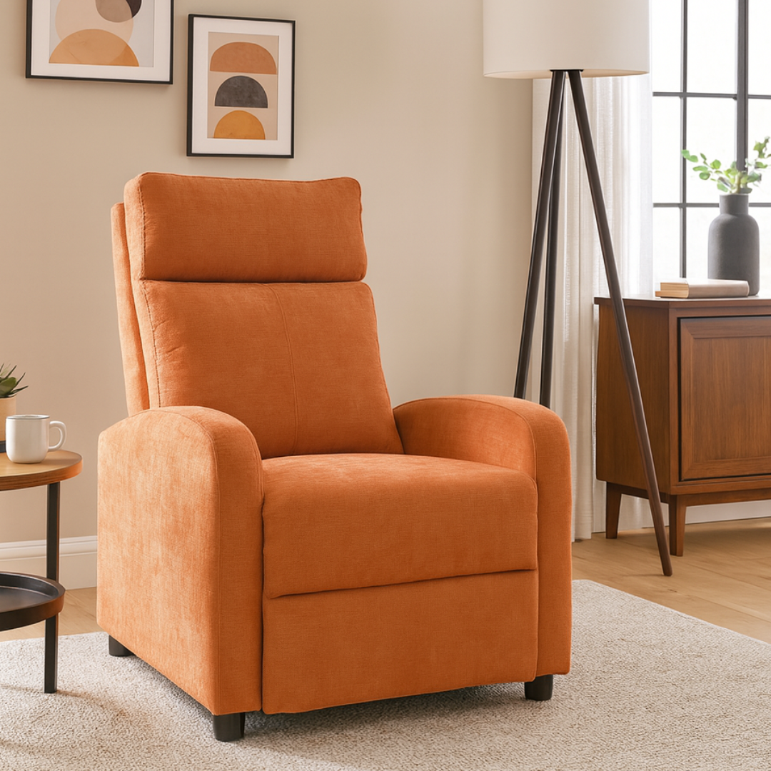 Adauga energie si stil in casa ta cu acest fotoliu recliner portocaliu, creat pentru relaxare totala si confort vizual. Perfect pentru living, birou sau coltul de lectura, acest fotoliu combina functionalitatea cu designul modern. Tapițeria textila premium ofera un aspect rafinat si este usor de intretinut, iar mecanismul manual recliner transforma orice moment intr-o experienta de relaxare.