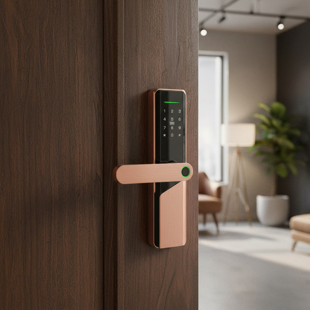 Incuietoare inteligenta cu acces 5 in 1, proiectata pentru siguranta avansata si utilizare intuitiva. Permite deblocarea prin amprenta digitala, cod PIN, card, cheie mecanica si aplicatia Tuya, oferind control complet si flexibilitate maxima.