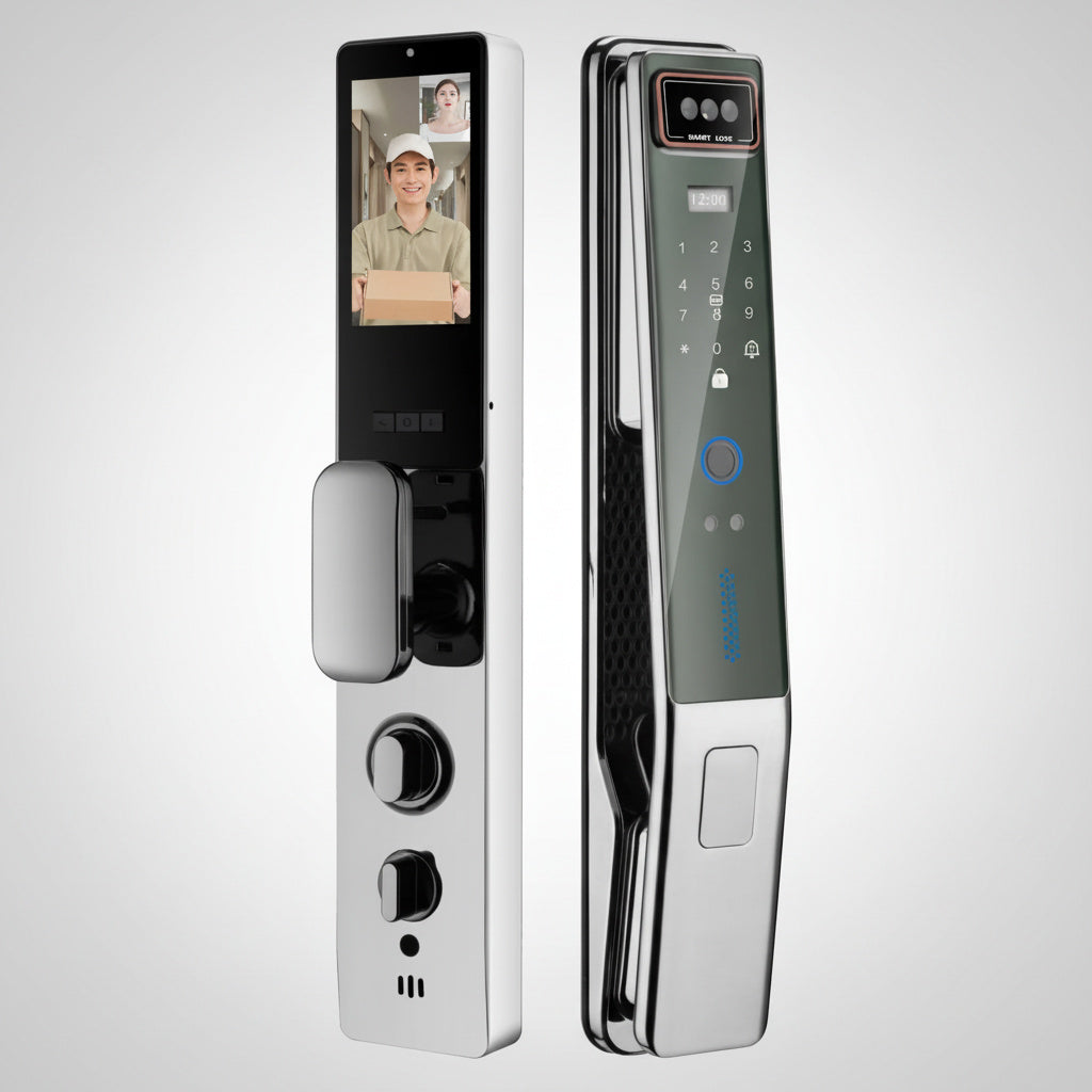 Incuietoare inteligenta cu recunoastere faciala si acces multifunctional, realizata din aliaj de aluminiu, disponibila in finisaj negru sau argintiu. Permite deblocarea prin recunoastere faciala, amprenta digitala, cod PIN, card IC, cheie mecanica si aplicatie Tuya, oferind un nivel ridicat de siguranta si confort.