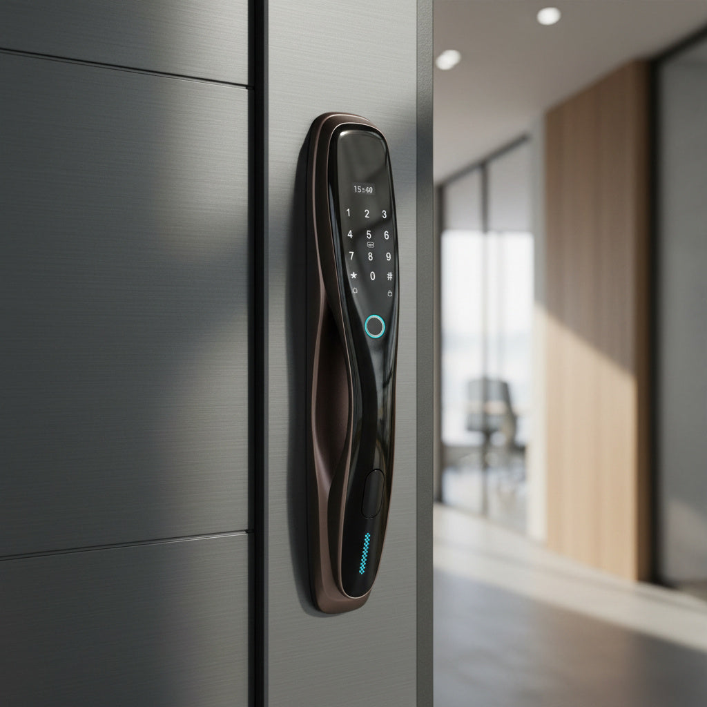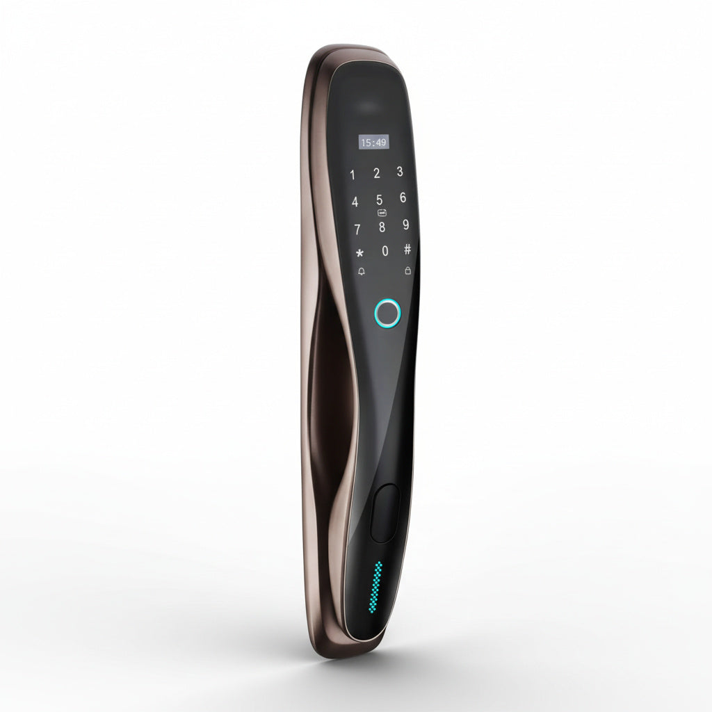 Incuietoare inteligenta cu design clasic, realizata din aliaj de aluminiu cu finisaj bronz antichizat, conceputa pentru a imbina siguranta moderna cu un aspect rafinat. Permite accesul prin amprenta digitala, cod PIN, card sau cheie mecanica, oferind multiple optiuni de deblocare pentru un plus de confort si securitate.