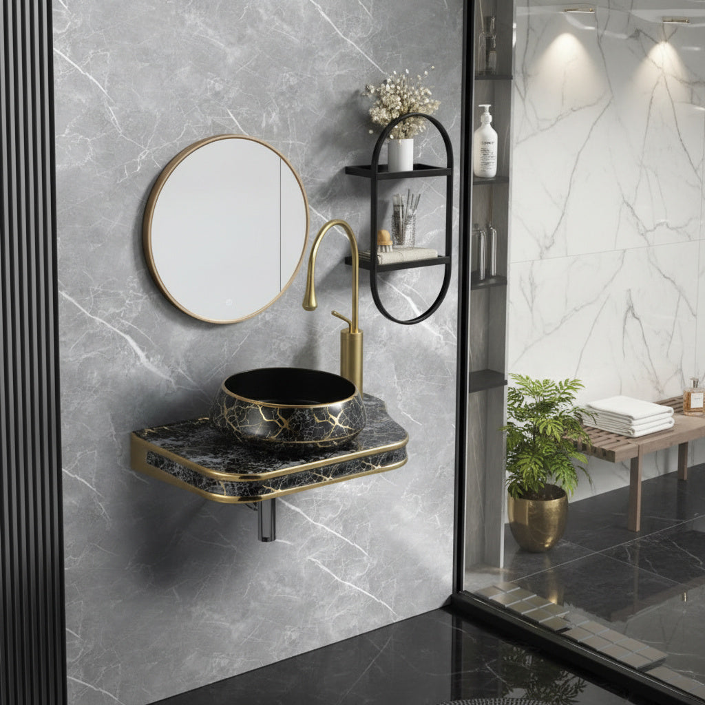 Combinatia dintre negrul intens si liniile aurii creeaza un efect vizual sofisticat, transformand lavoarul intr-o piesa de design de exceptie. Ideal pentru bai moderne, glam sau proiecte premium.