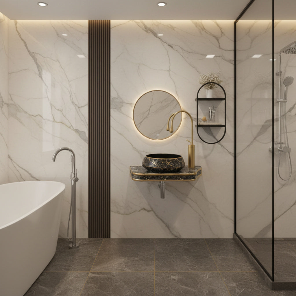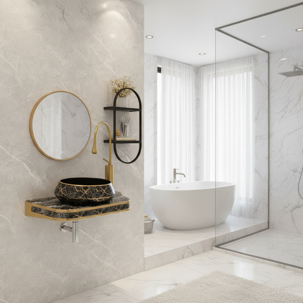 Design modern si luxury – Model oval cu finisaj negru lucios si efect marmura aurie, perfect pentru bai elegante si high-end.