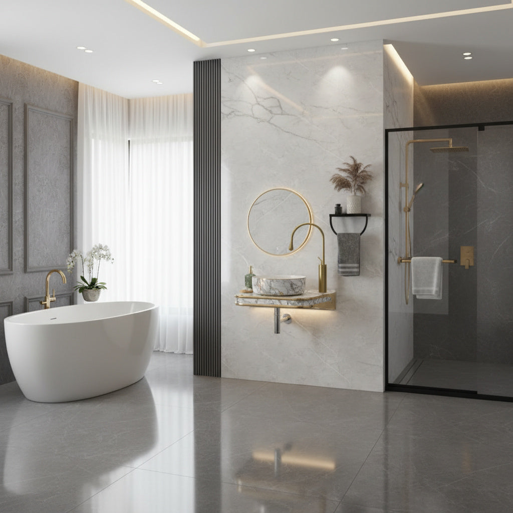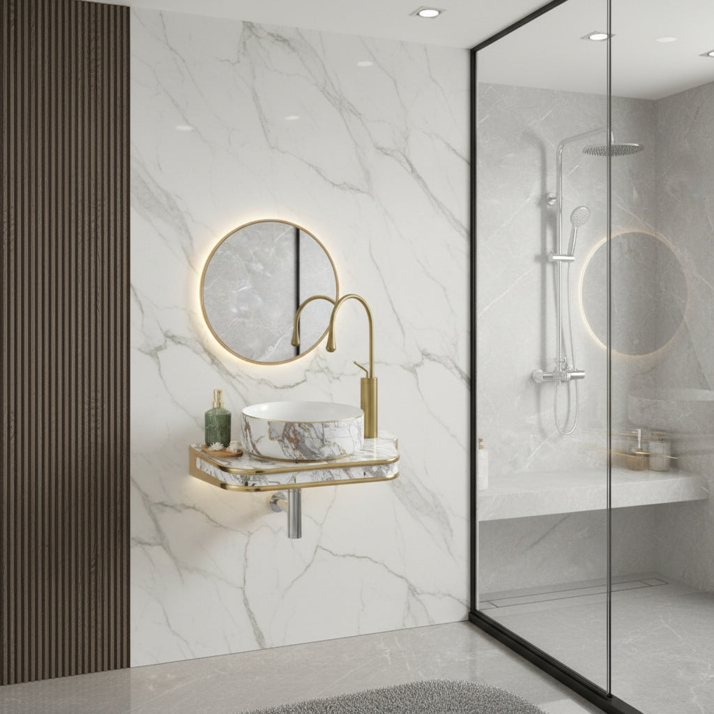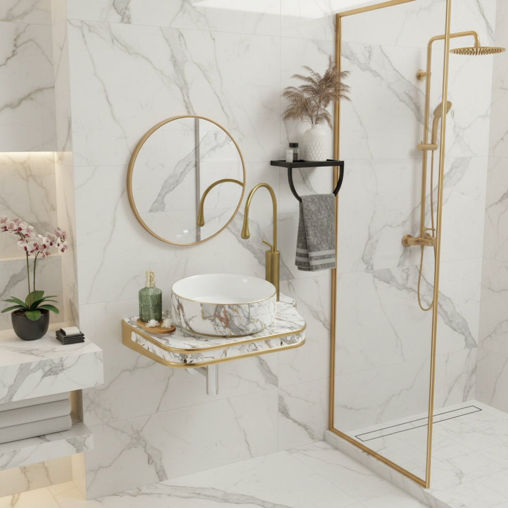 Design modern si elegant – Model cu aspect marmorat, accente aurii si linii fine, perfect pentru bai stil luxury sau contemporane.