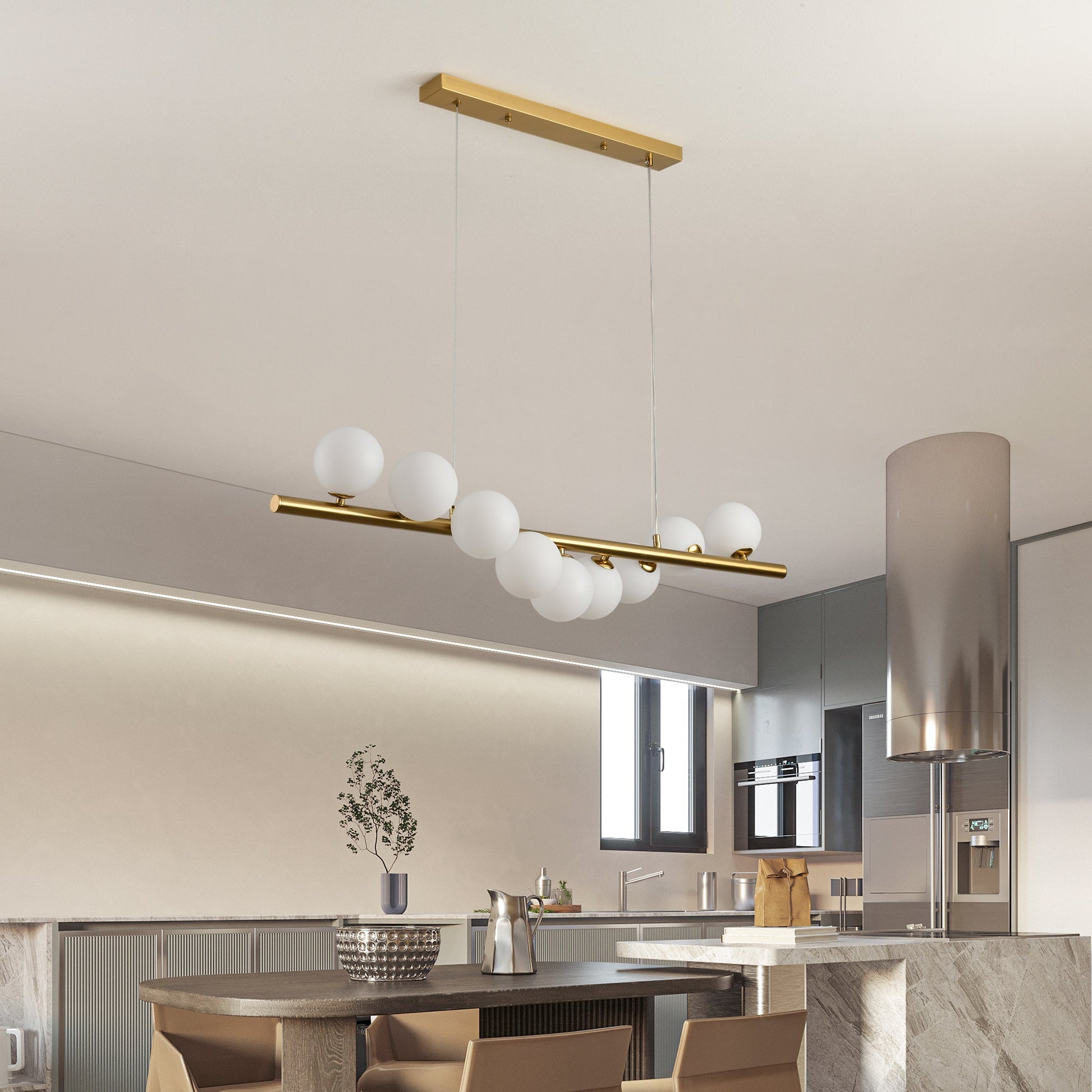 ✔ Design liniar modern – Bara aurie eleganta cu 9 globuri din sticla mata.