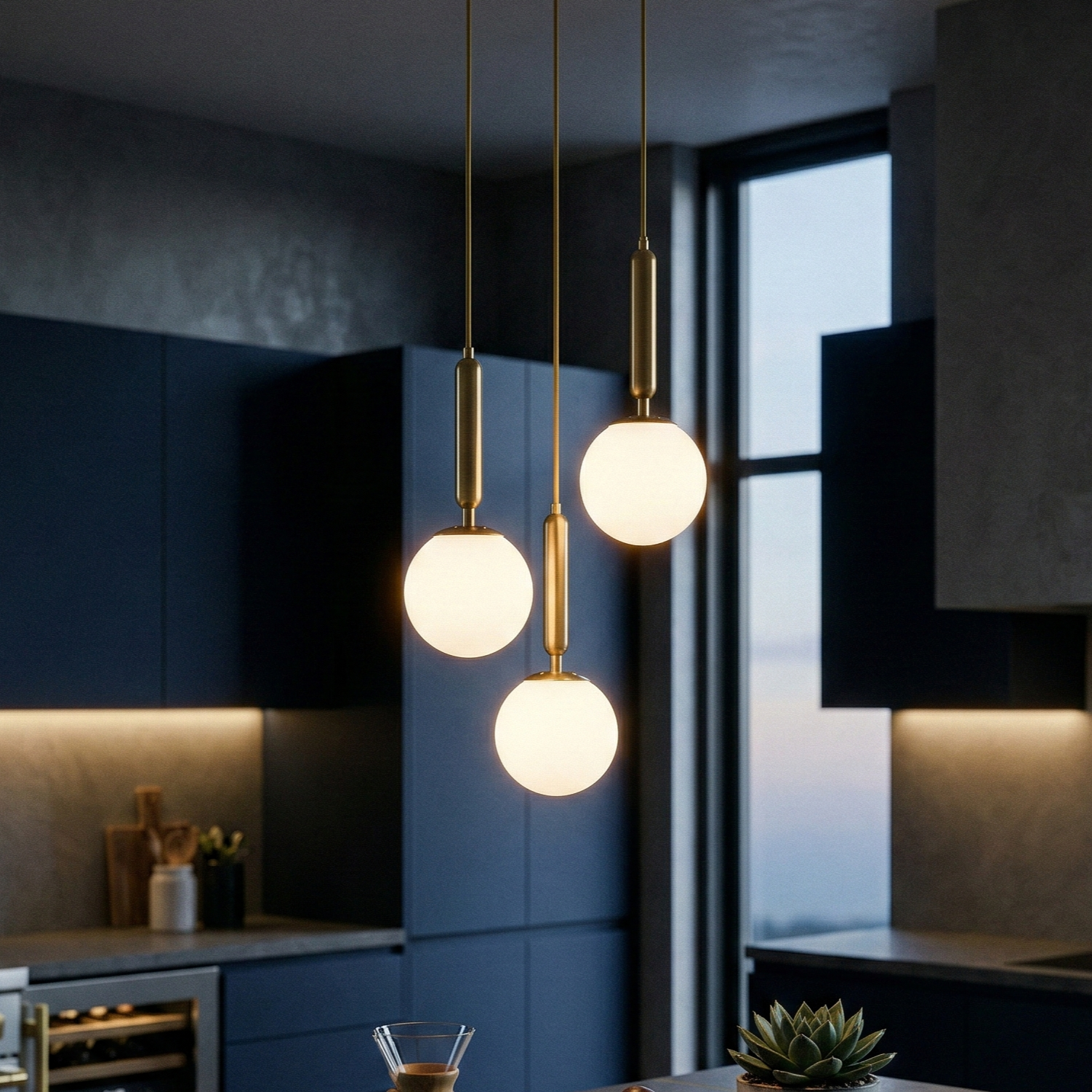 Realizata din metal si sticla premium, lustra imbina perfect nuanta auriu + alb, oferind un aer luxos si contemporan. Cele trei globuri cu diametrul de 15 cm sunt realizate din sticla mata, asigurand o dispersie delicata si uniforma a luminii, ideala pentru dining, living sau deasupra unei insule moderne.