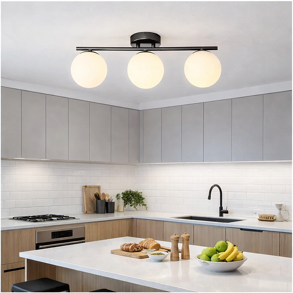 | Material | Structura metalica neagra, abajururi din sticla alba |