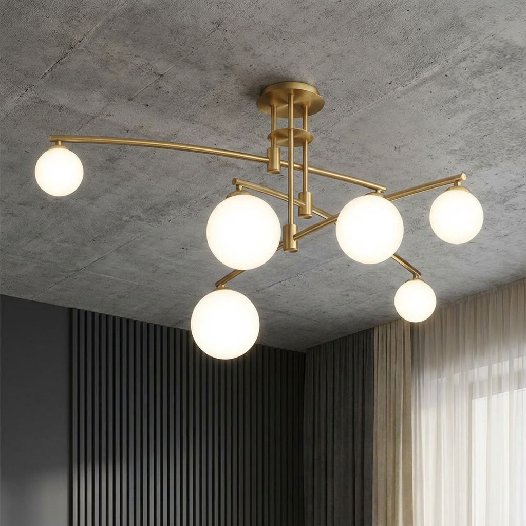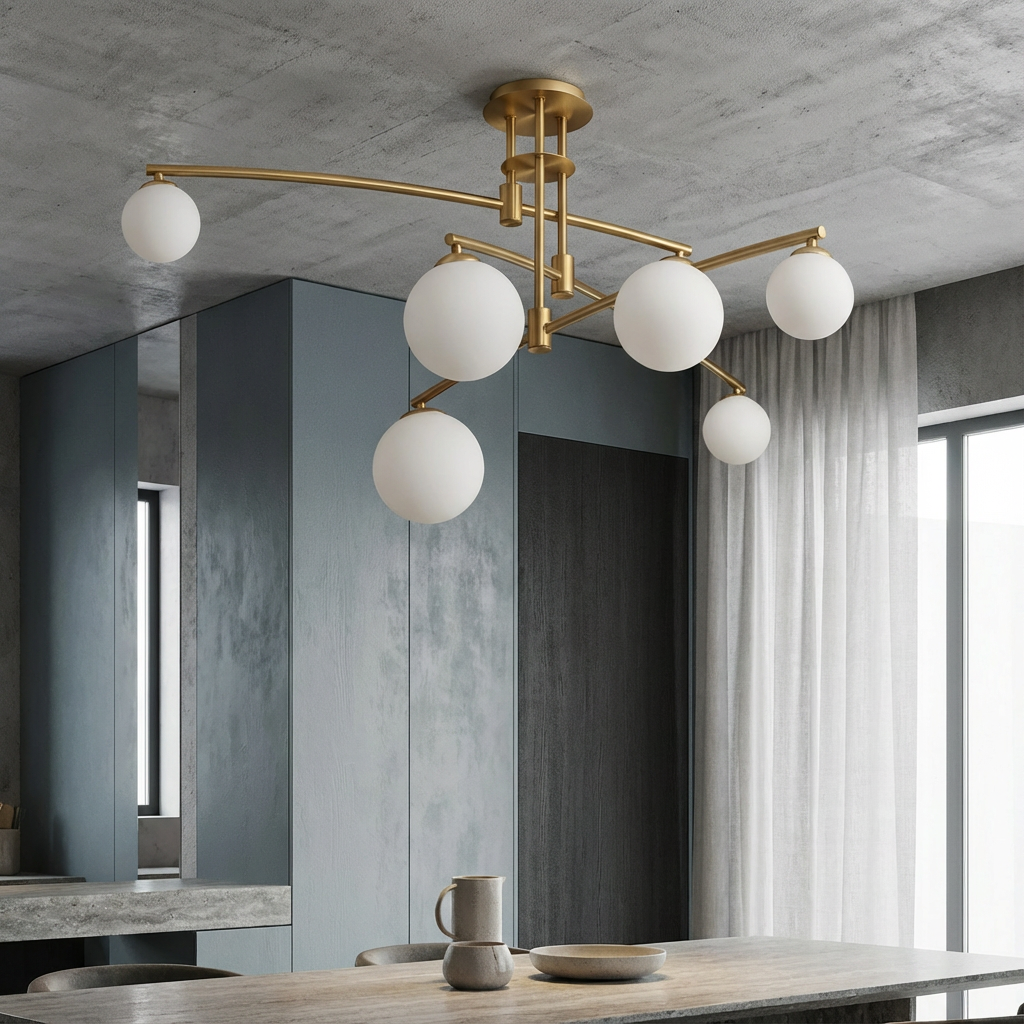 Lustra MATEO 6xE27 Gold aduce un stil modern si rafinat oricarei incaperi. Abajururile din sticla alba creeaza o lumina placuta si uniforma, iar structura aurie completa designul minimal si elegant. Este o alegere potrivita pentru spatii mari, unde poate deveni rapid piesa centrala a camerei.