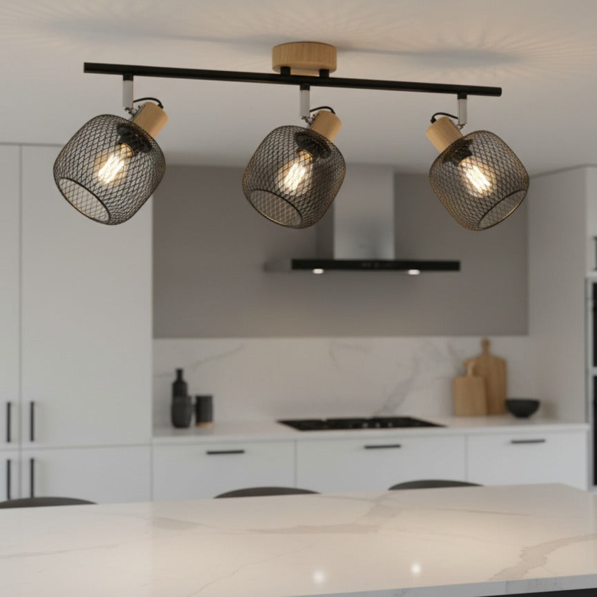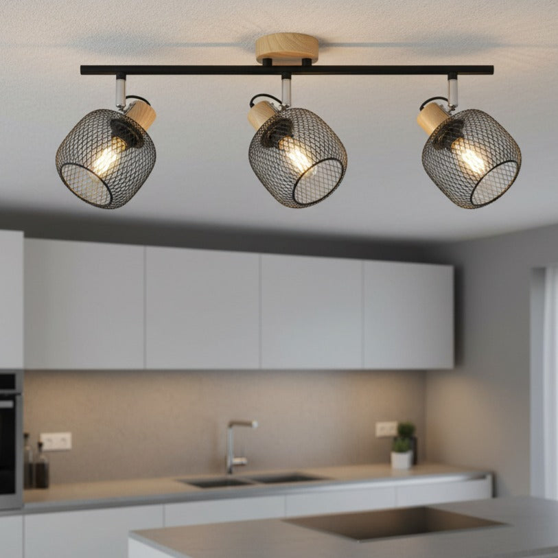Lustră BEKA cu 3 Spoturi Reglabile Black & Brown este un corp de iluminat decorativ cu stil industrial–modern, ideal pentru living, dining, holuri sau spații comerciale precum cafenele și restaurante. Designul combină armonios structura metalică neagră cu elementele din lemn și abajururile metalice tip plasă, oferind un aspect cald, modern și bine echilibrat.