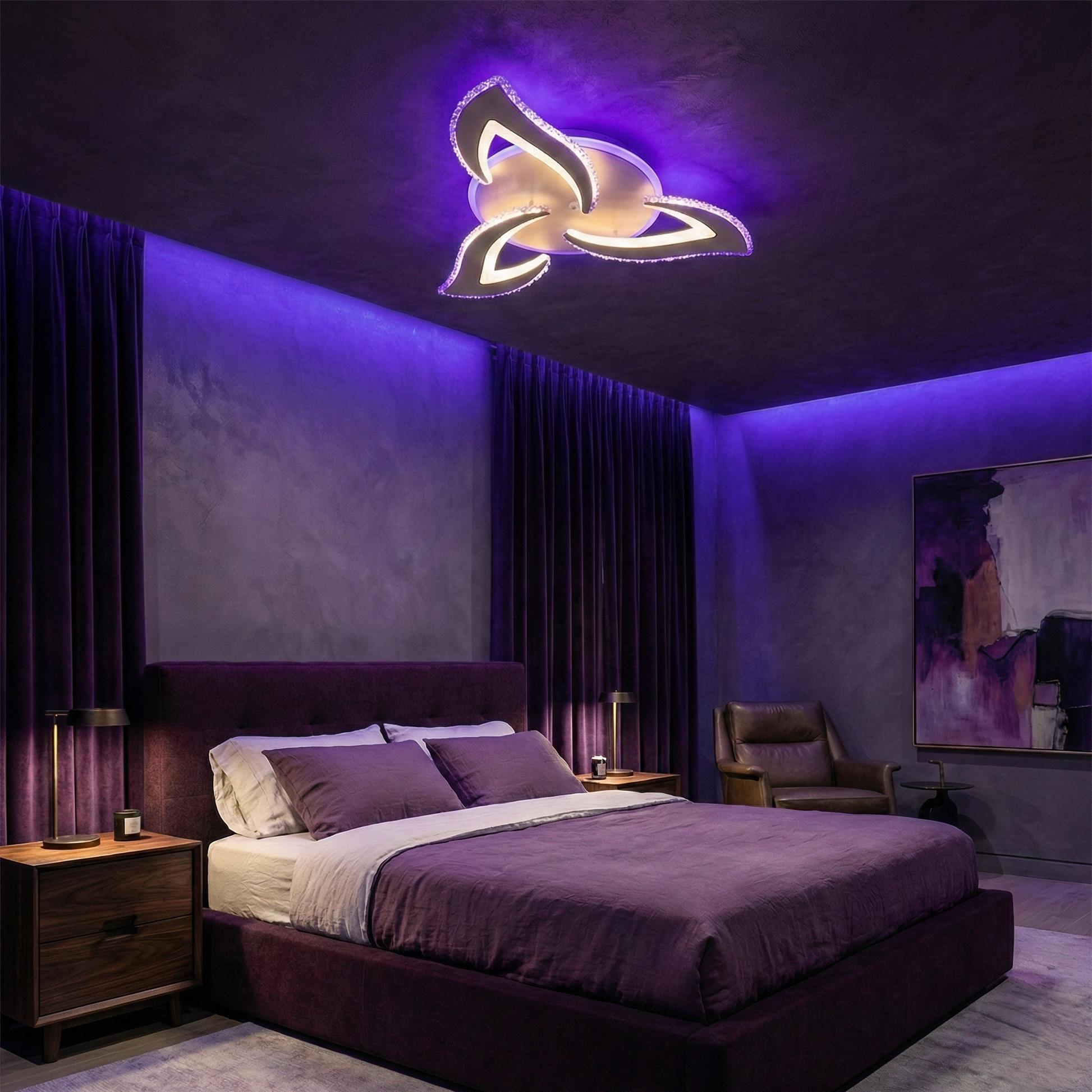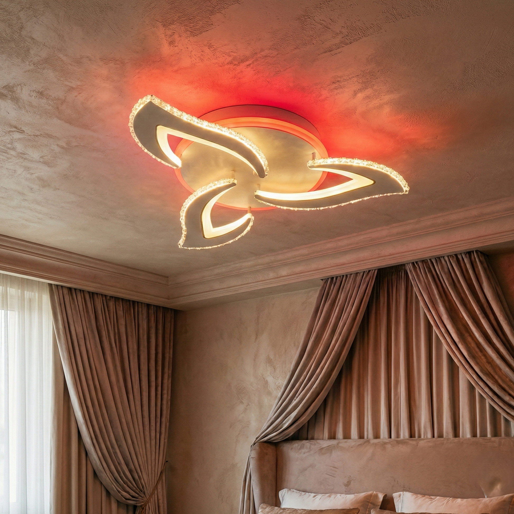 Lustra LED Mini Camelia Cristal Alba RGB Telecomanda Echivalent 300W este alegerea ideala pentru interioare moderne care au nevoie de un corp de iluminat compact, elegant si foarte versatil. Designul cu 3 petale stilizate, completat de margini tip cristal, creeaza un efect decorativ spectaculos chiar si atunci cand lustra este stinsa.