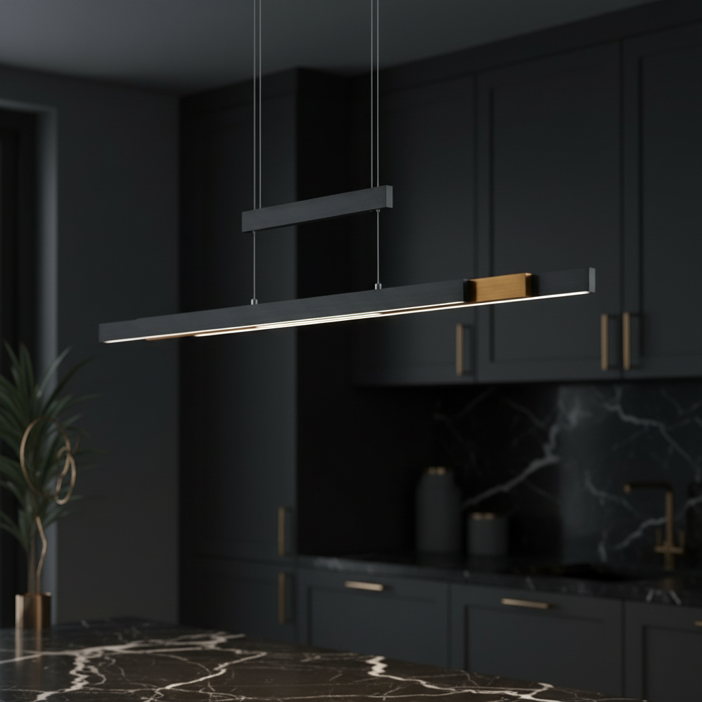 Lustra ENZO impresioneaza printr-un design liniar, modern, creat pentru interioare contemporane si spatii bine definite. Forma eleganta si combinatia de black mat cu accente brass adauga un contrast rafinat, ideal pentru zonele de dining sau living.
