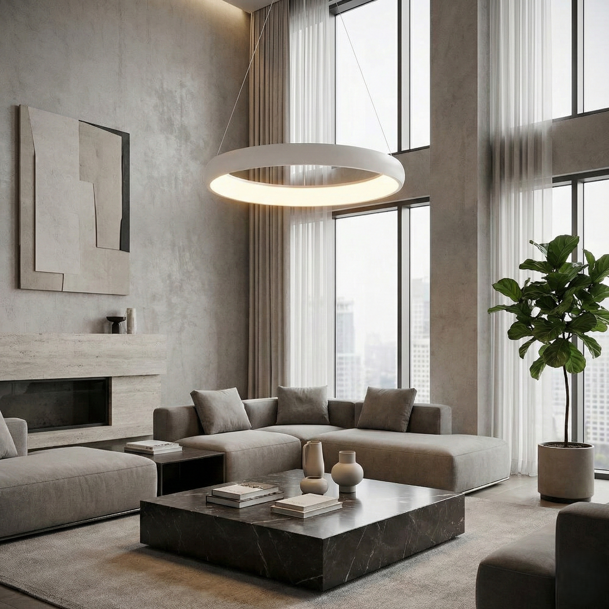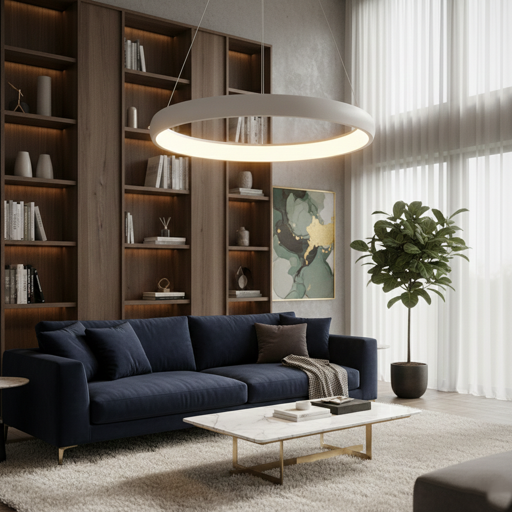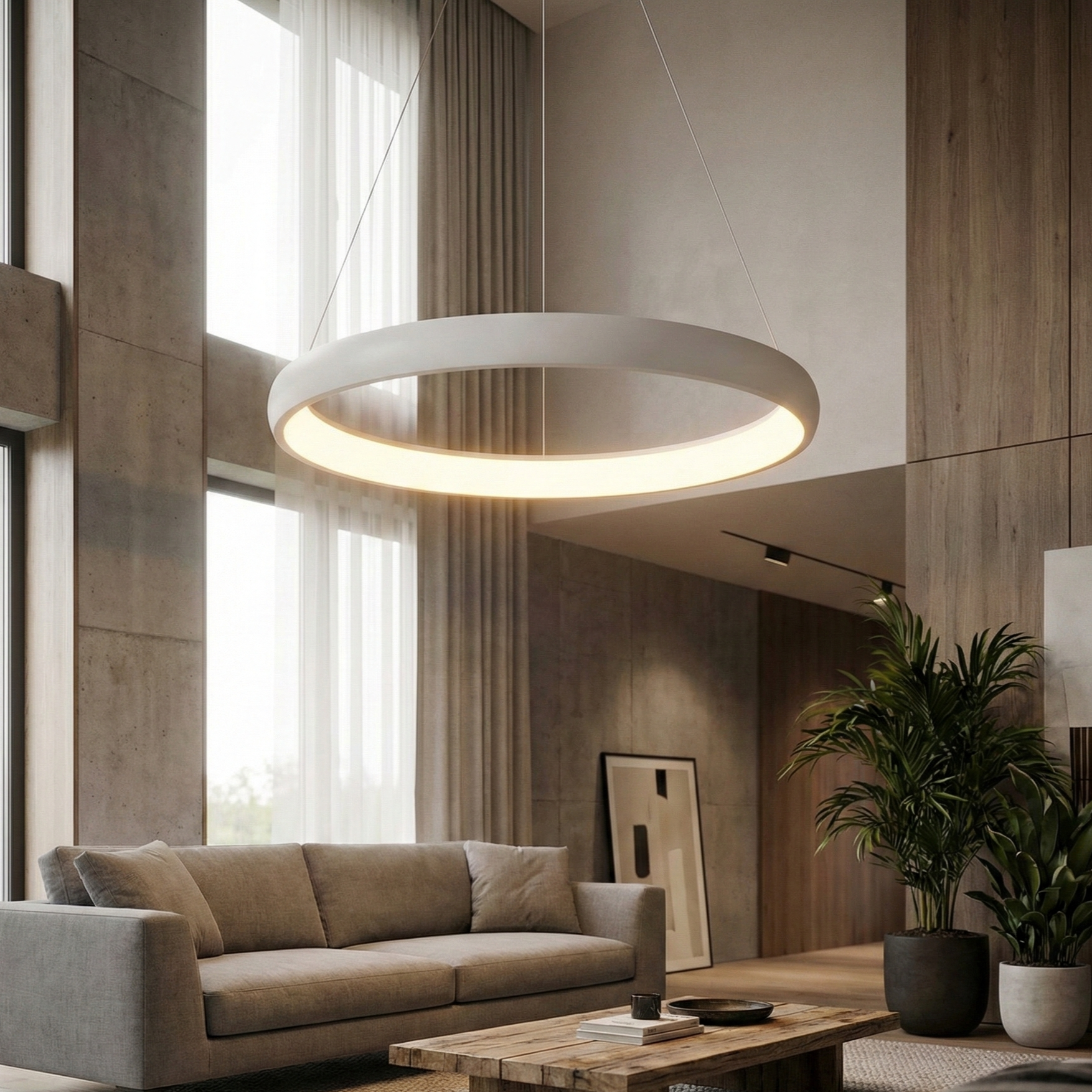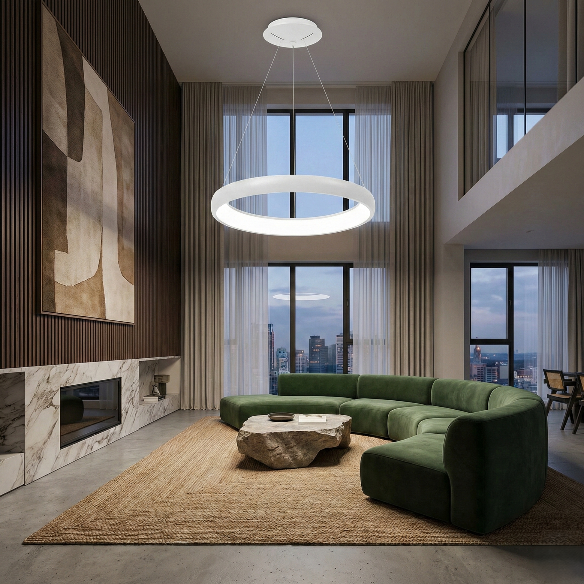 Lustra LED Suspendata BELLA White, 3 Lumini din buton, Echivalent 500W este o piesa moderna cu design minimalist, ideala pentru livinguri cu tavan inalt, dininguri elegante sau spatii open-space contemporane. Forma circulara si finisajul alb mat ofera un aspect rafinat, iar iluminarea uniforma la 360° creeaza un ambient echilibrat si placut.