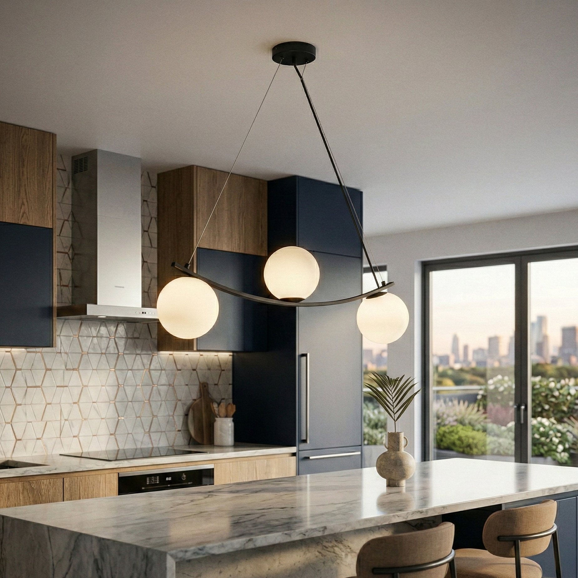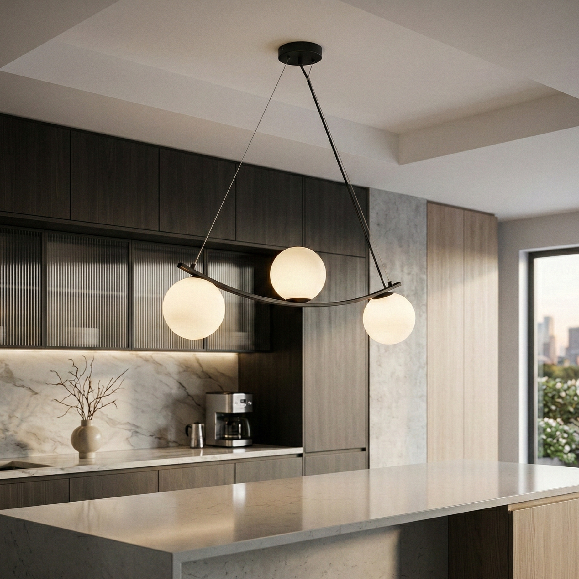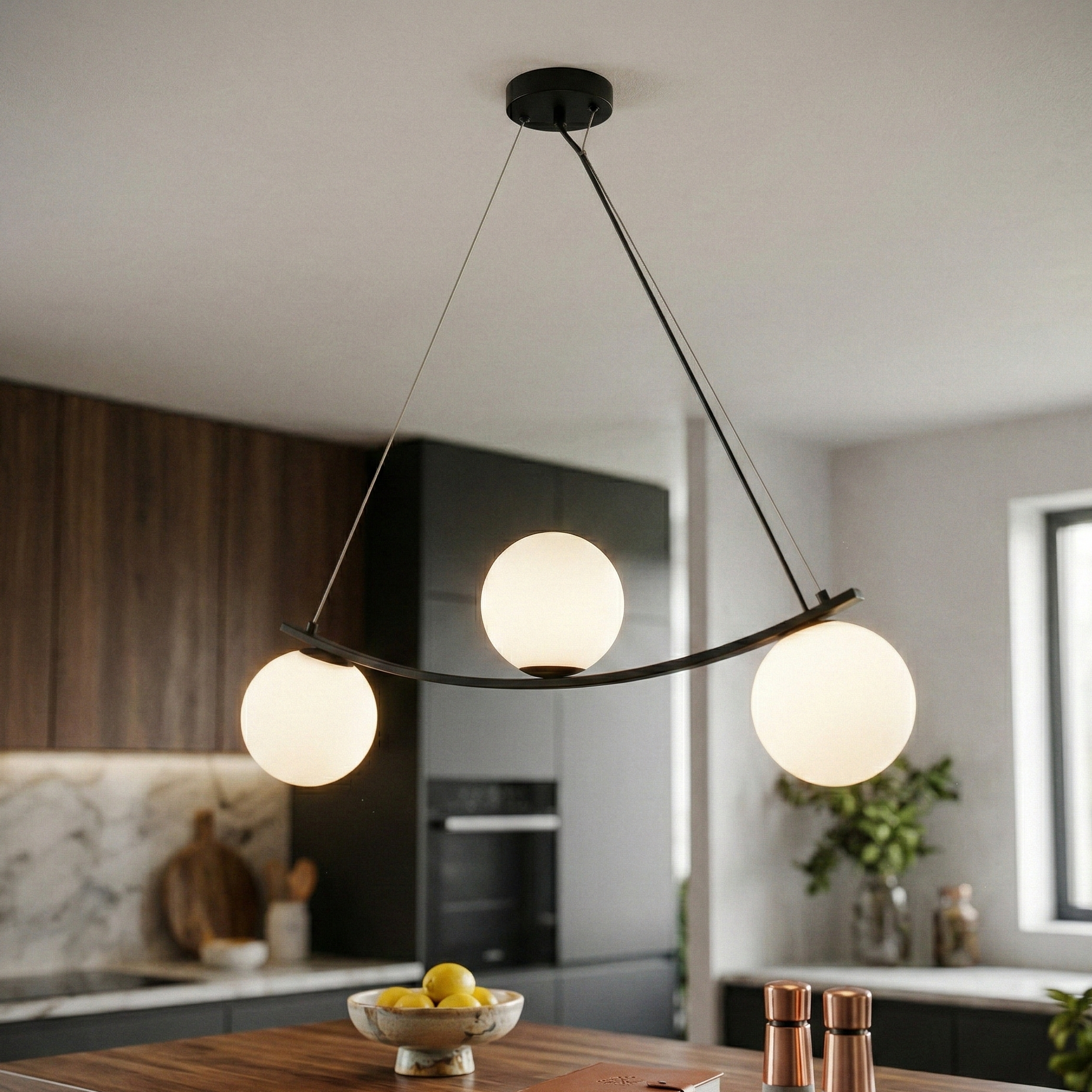 Structura din metal negru contrasteaza armonios cu abajururile albe, mate, oferind un aspect modern si sofisticat. Globurile din sticla mata asigura o dispersie uniforma a luminii, reducand efectul de orbire si contribuind la o atmosfera calda si primitoare.