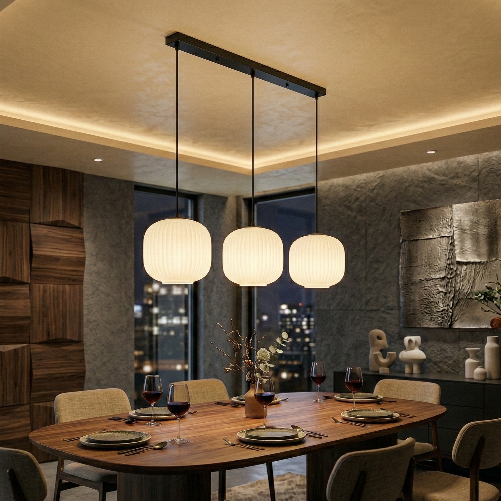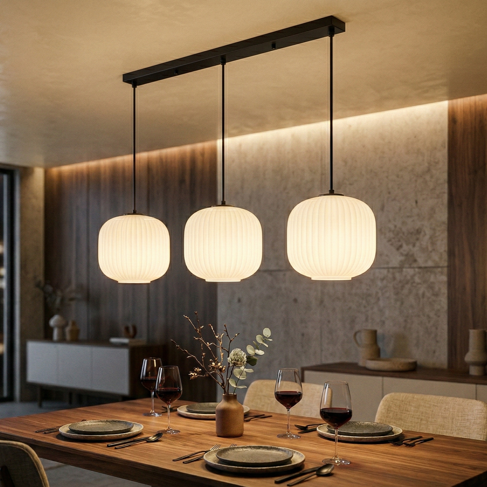 - Design Elegant: Lustra are un design modern și elegant, cu un cadru din metal negru și trei abajururi din sticlă, fiecare cu un diametru de 20 cm. Aceste elemente se îmbină armonii pentru a crea un punct focal atrăgător în orice încăpere.