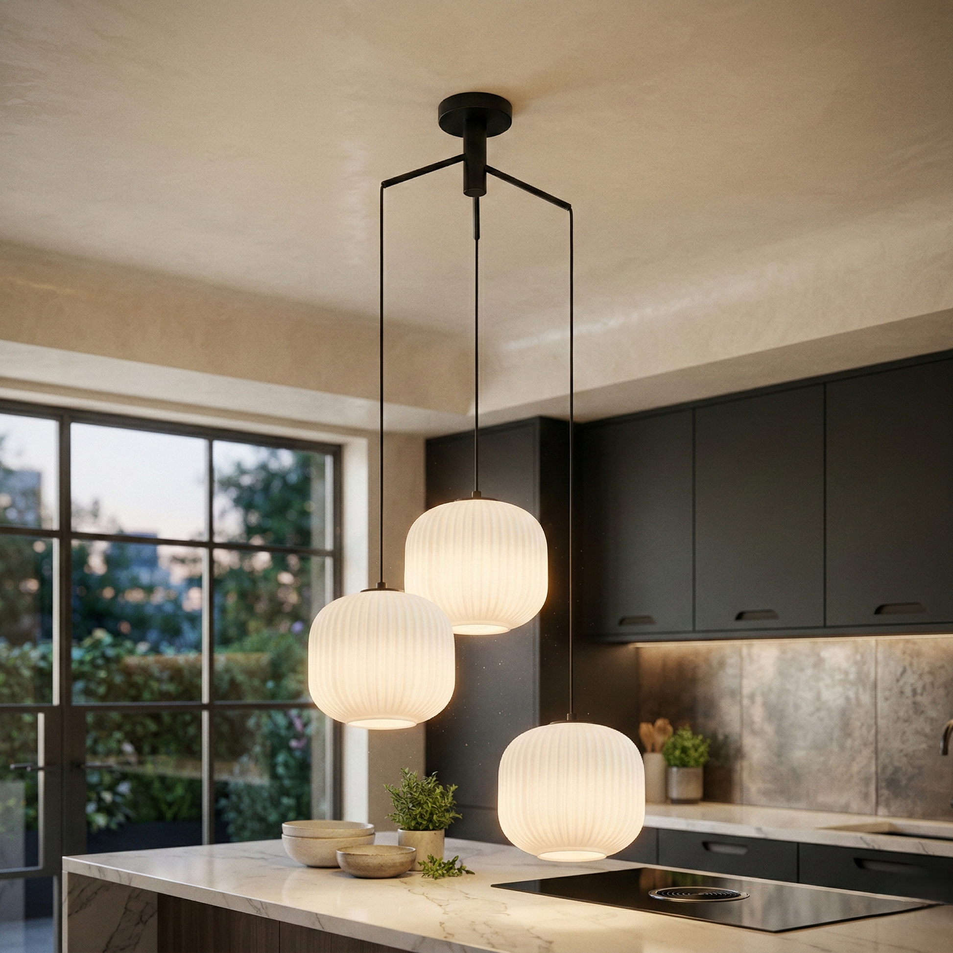 - Design Elegant: Lustra are un design modern și elegant, cu un cadru din metal negru și trei abajururi din sticlă, fiecare cu un diametru de 20 cm. Aceste elemente se îmbină armonios pentru a crea un punct focal atrăgător în orice încăpere.