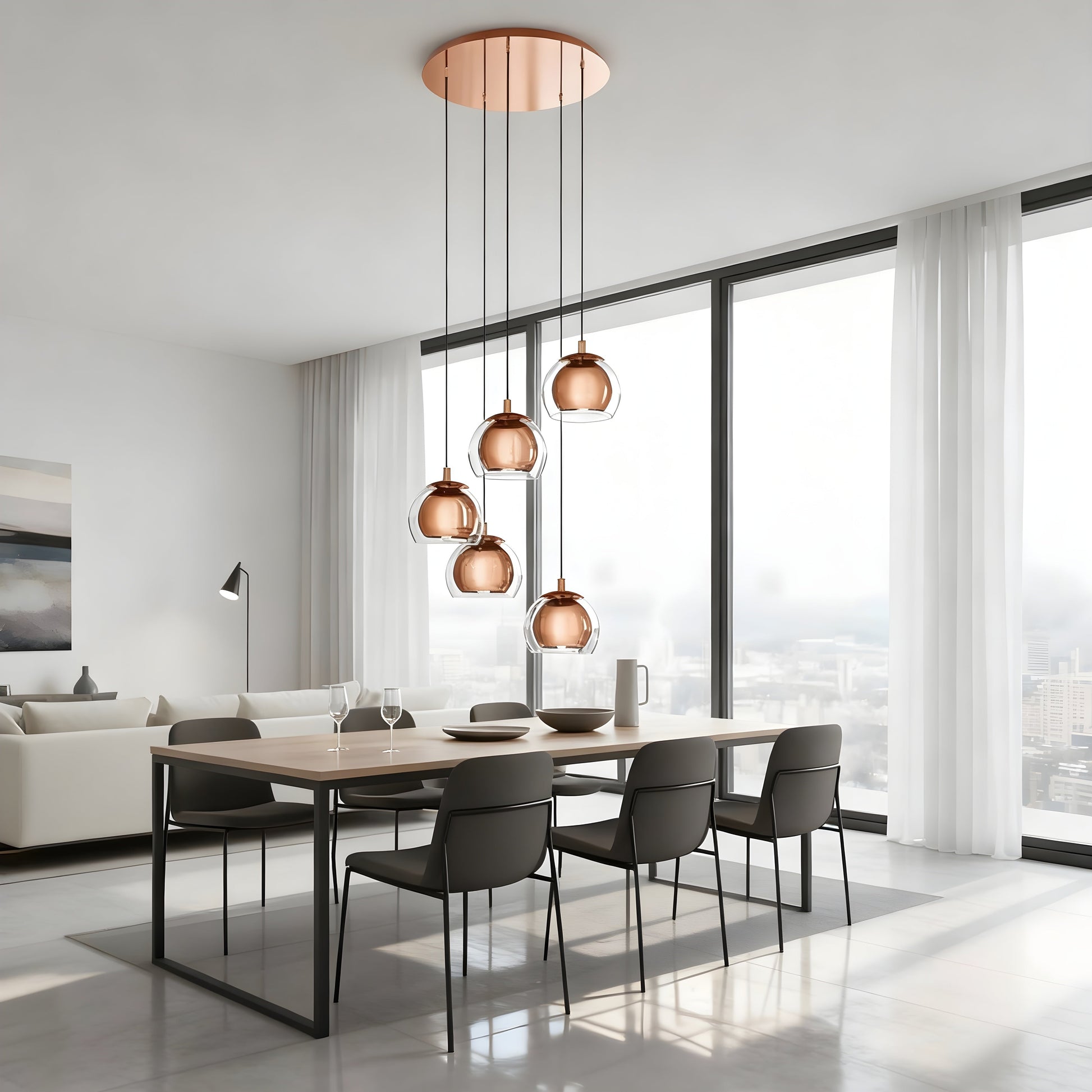 Lustra suspendată ROCAMAR are cinci abajururi sferice din sticlă transparentă, fiecare cu un abajur interior metalic finisat în cupru. Designul este completat de un suport rotund din metal, în nuanță de cupru. Această lustră elegantă, tip cluster, adaugă un plus de rafinament interioarelor moderne, oferind o iluminare stilată în living sau deasupra mesei din sufragerie. Becurile nu sunt incluse. Produsul are socluri E27 și necesită becuri E27.