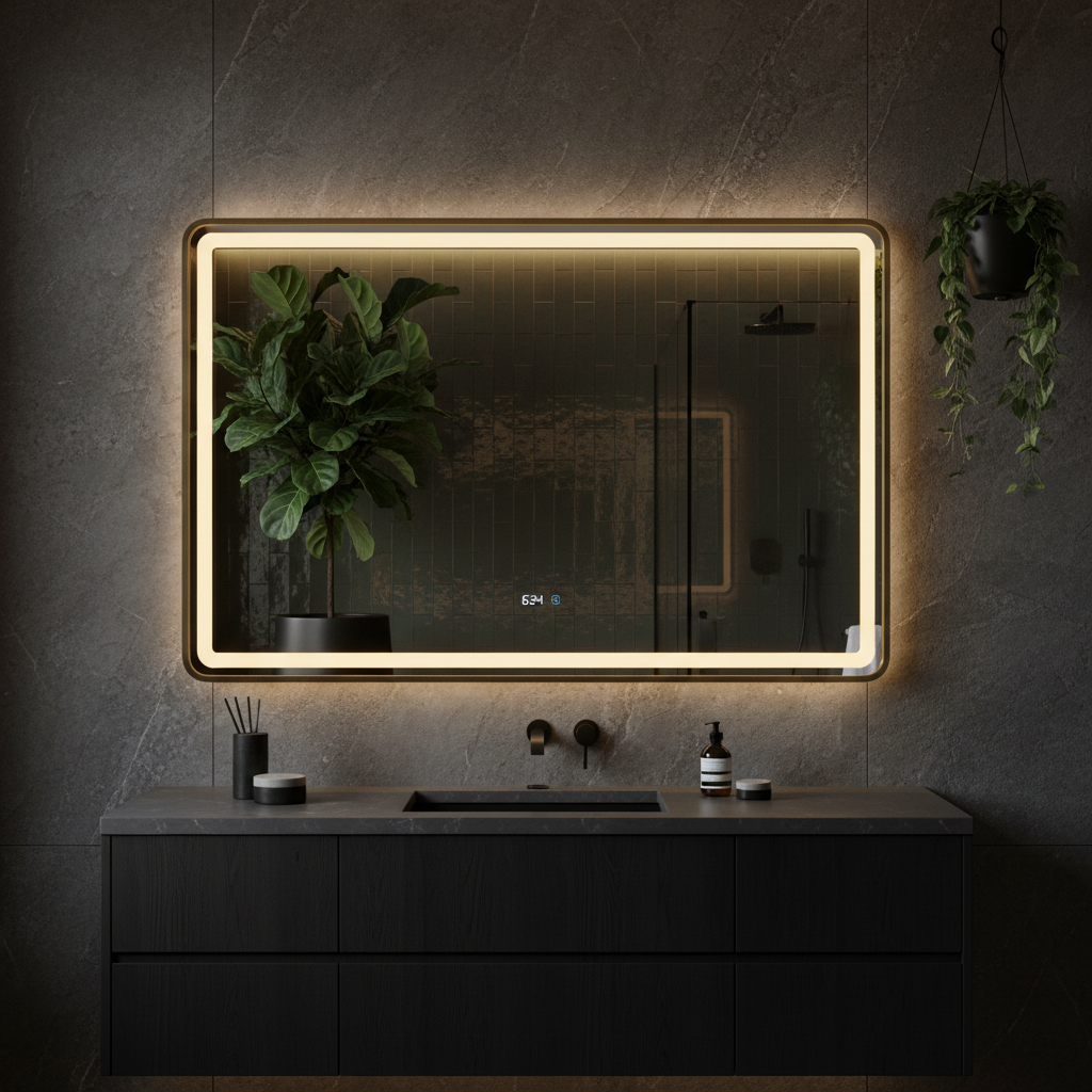 Oglinda LED OD058-101 Auriu aduce un plus de rafinament baii prin rama subtire din aluminiu cu finisaj auriu si iluminarea perimetrala discreta. Lumina reglabila creeaza o atmosfera placuta si functionala, ideala pentru rutina zilnica, iar afisajul de timp si temperatura completeaza experienta printr-un confort sporit si un aspect modern.