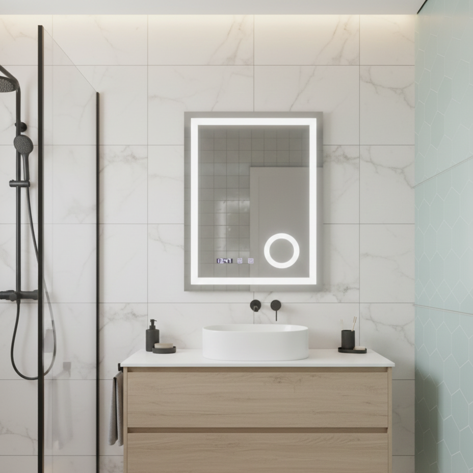 Lupă Cosmetică Integrată: Beneficiezi de o zonă cu mărire direct pe suprafața oglinzii, iluminată perimetral, pentru a vedea fiecare detaliu cu o claritate impecabilă.