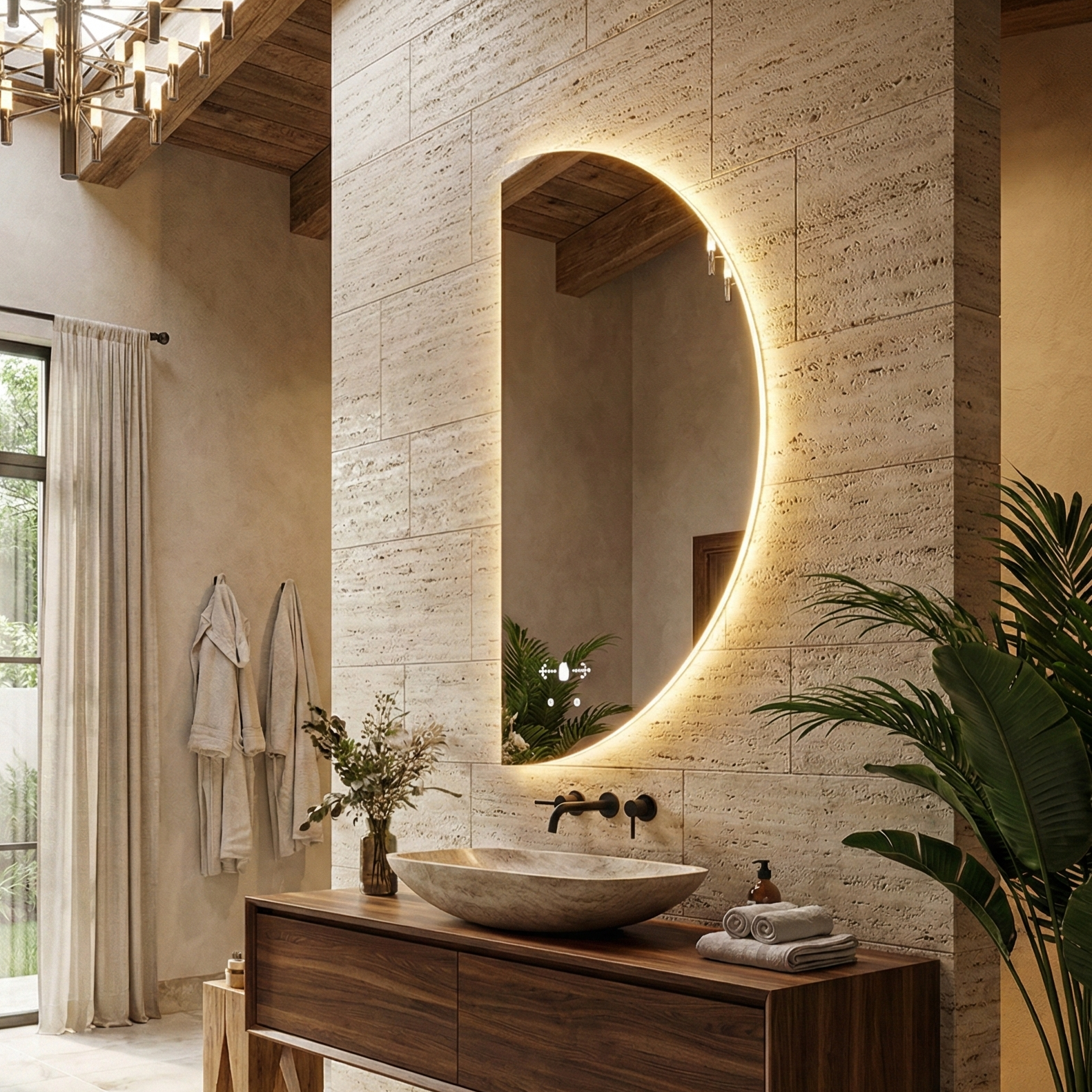 Oglinda LED MEZZALUNA este alegerea ideala pentru cei care cauta un design distinct, inspirat de eleganta lunara, combinat cu functionalitate practica si iluminare adaptabila.