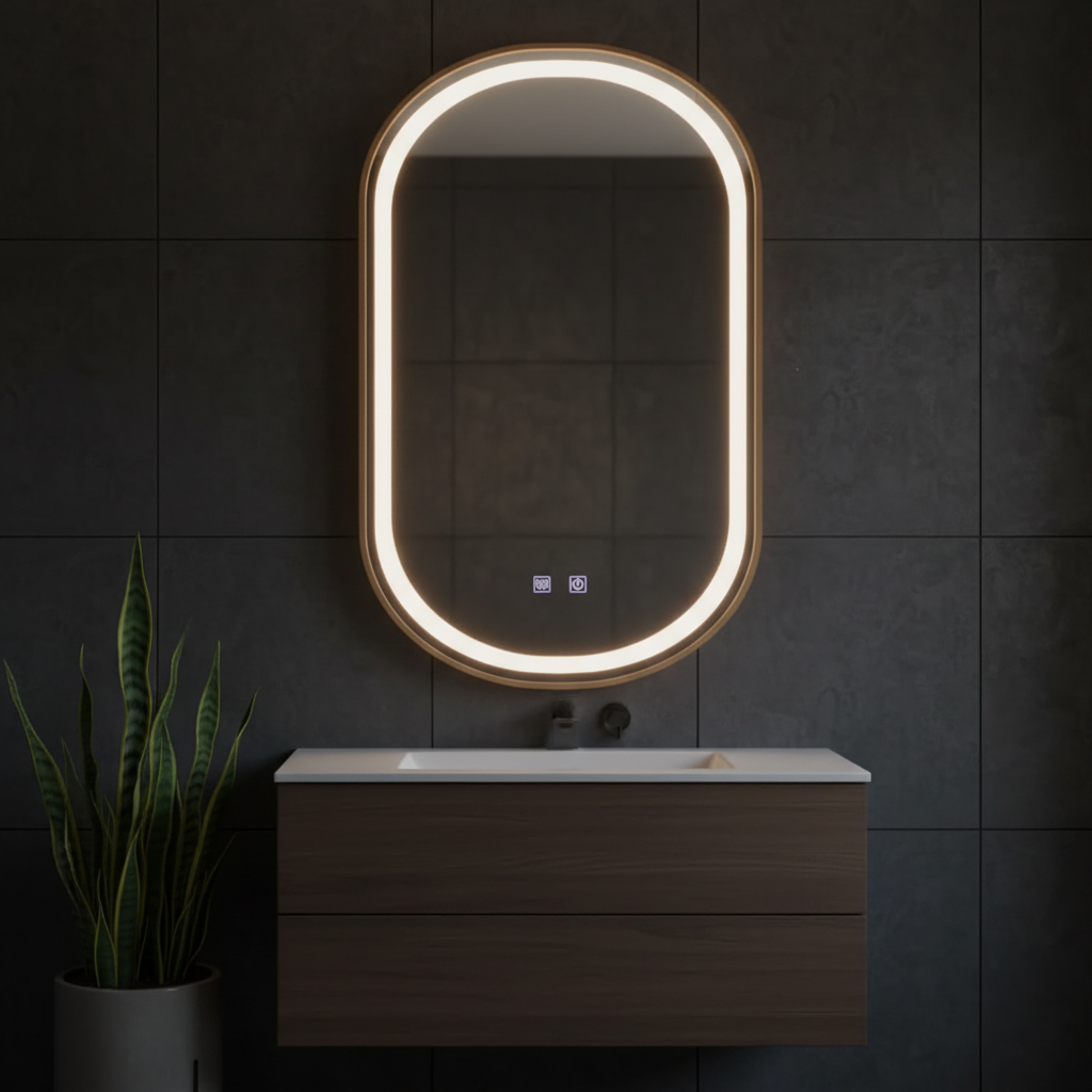 Oglinda LED ovala LUCA aduce un plus de stil si functionalitate baii tale, prin forma sa moderna si rama Rose Gold cu aspect premium. Iluminarea integrata contureaza frumos oglinda si ofera o lumina utila pentru activitatile de zi cu zi, iar controlul touch face utilizarea rapida si intuitiva. Functia de dezaburire mentine suprafata clara, astfel incat oglinda ramane perfect utilizabila chiar si in conditii de umiditate ridicata.
