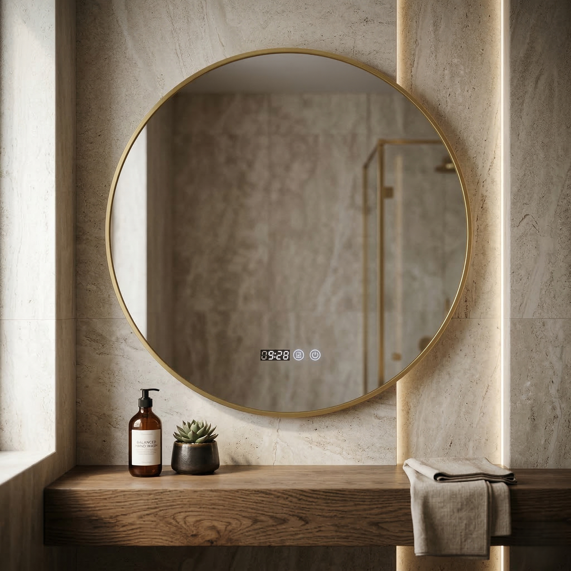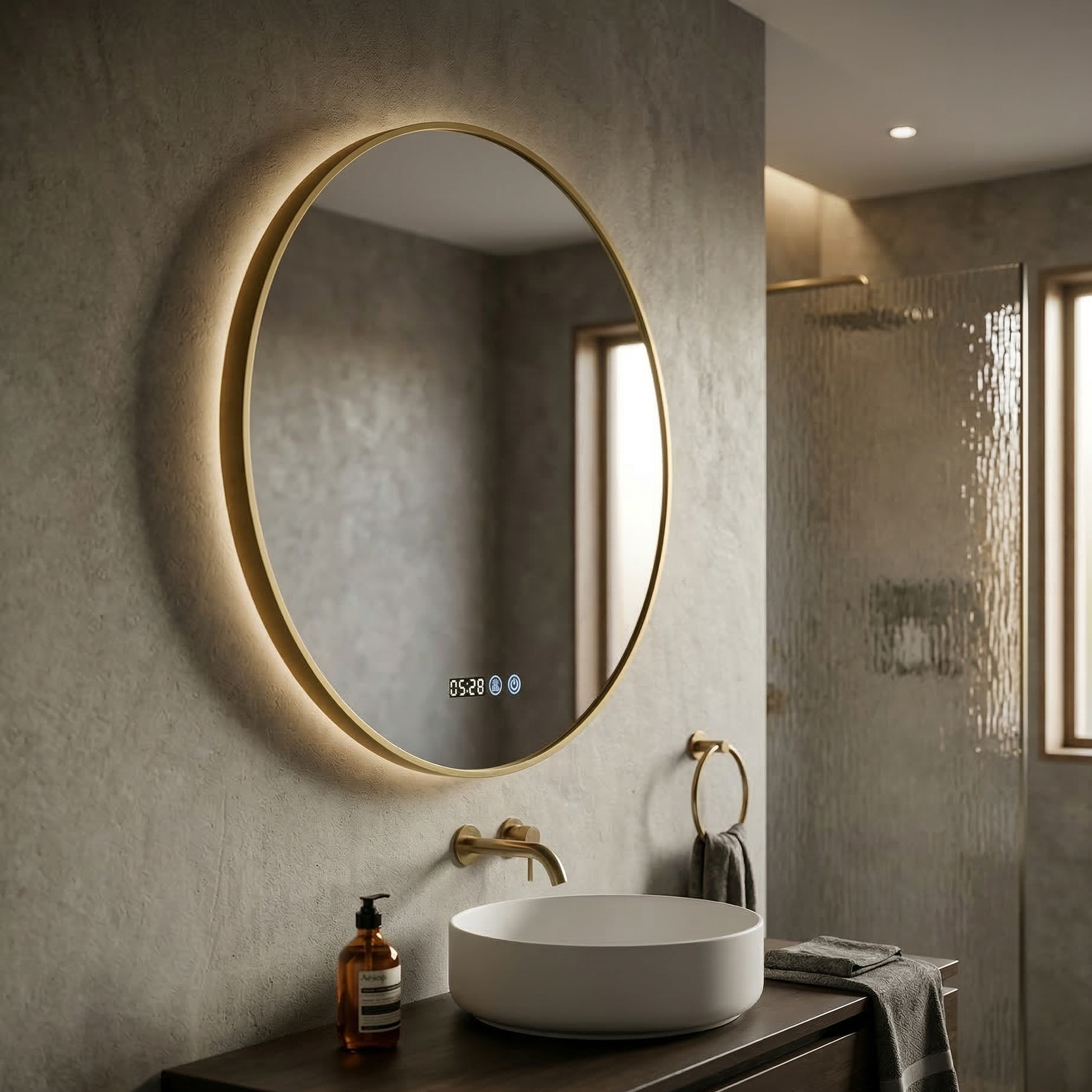Oglinda LED Rotunda 80cm Rama Aurie, Ceas, Temperatura, Touch si 3 Lumini