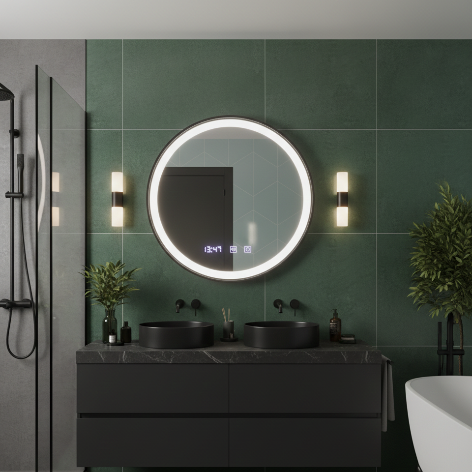 • Contrast si Eleganta: Rama neagra ofera un contur precis si modern, fiind alegerea perfecta pentru baile cu accesorii negre, elemente industriale sau finisaje din piatra si lemn.
