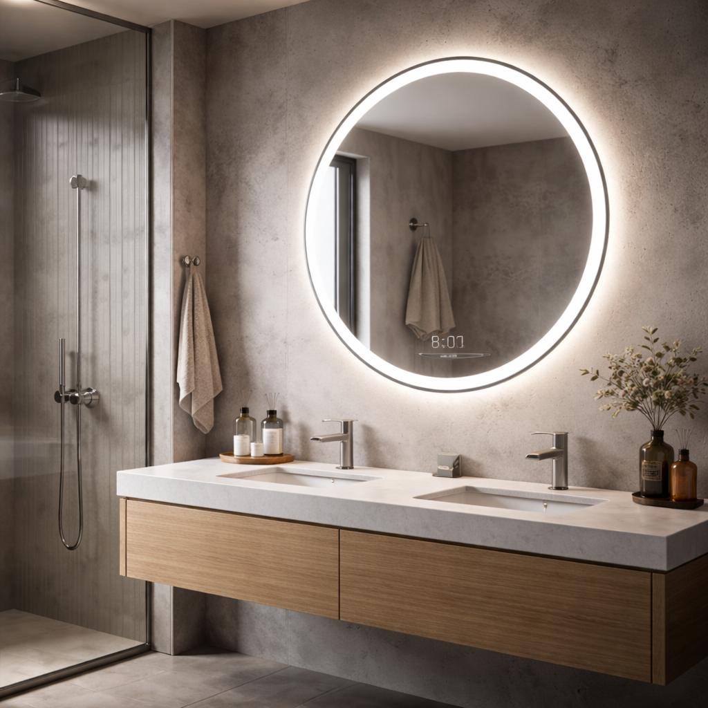 Cu dimensiunea de 70x70 cm si un design fara rama, BASILORA creeaza un efect vizual aerisit si sofisticat, punand in valoare peretele si iluminarea ambientala. Forma rotunda aduce echilibru si rafinament, fiind potrivita atat pentru bai rezidentiale, cat si pentru spatii premium.