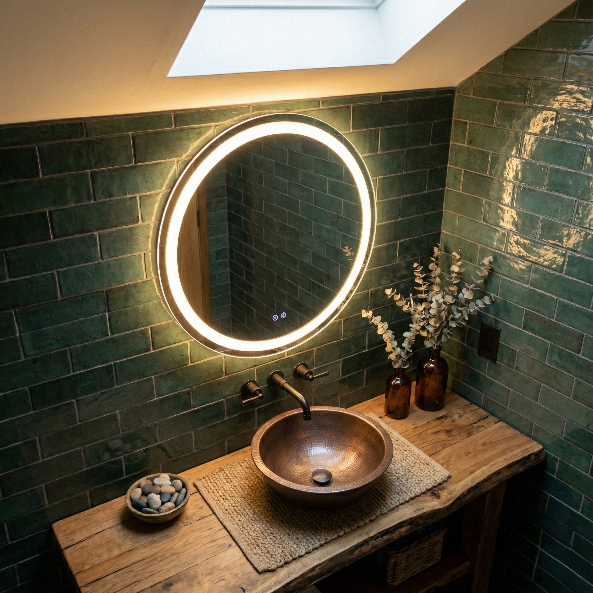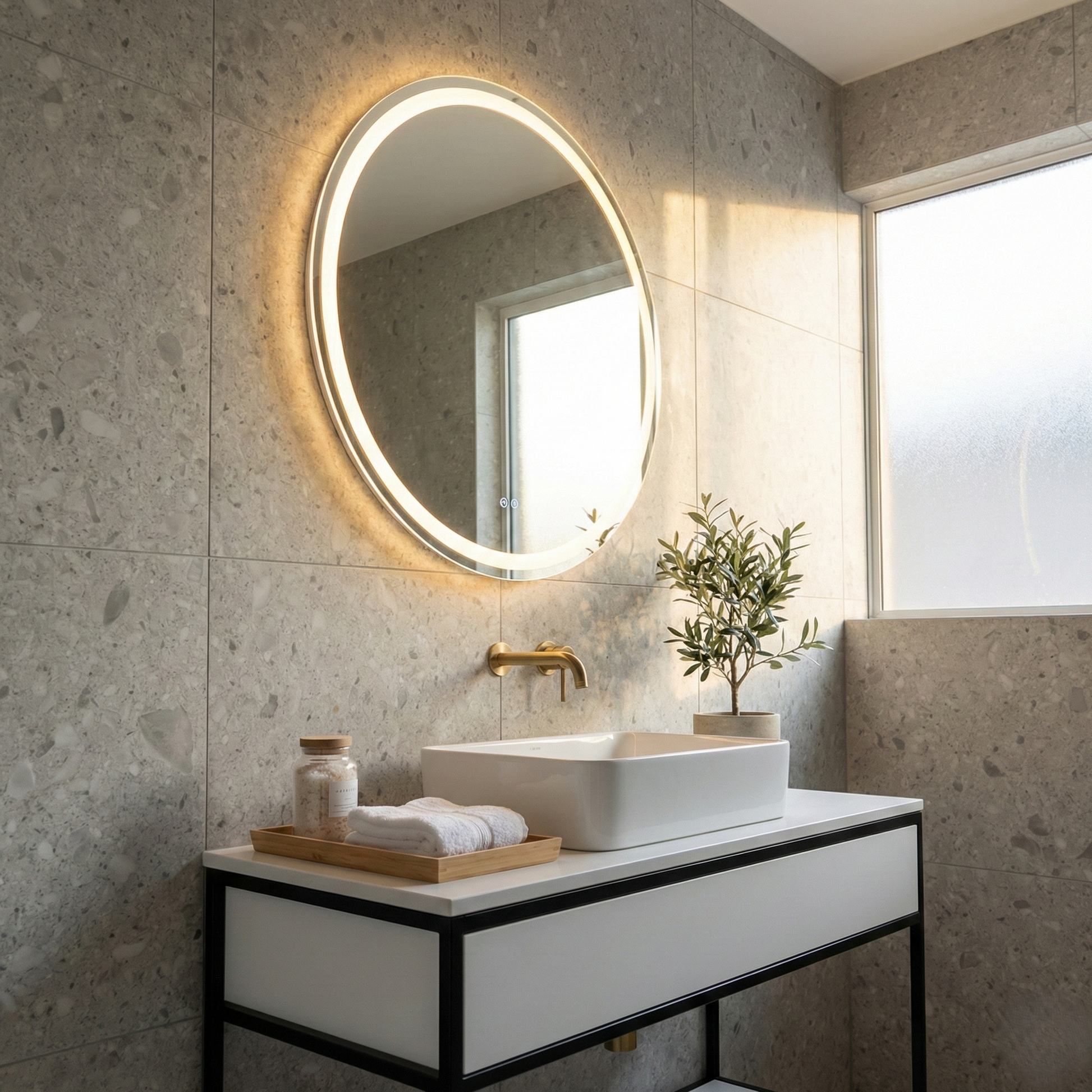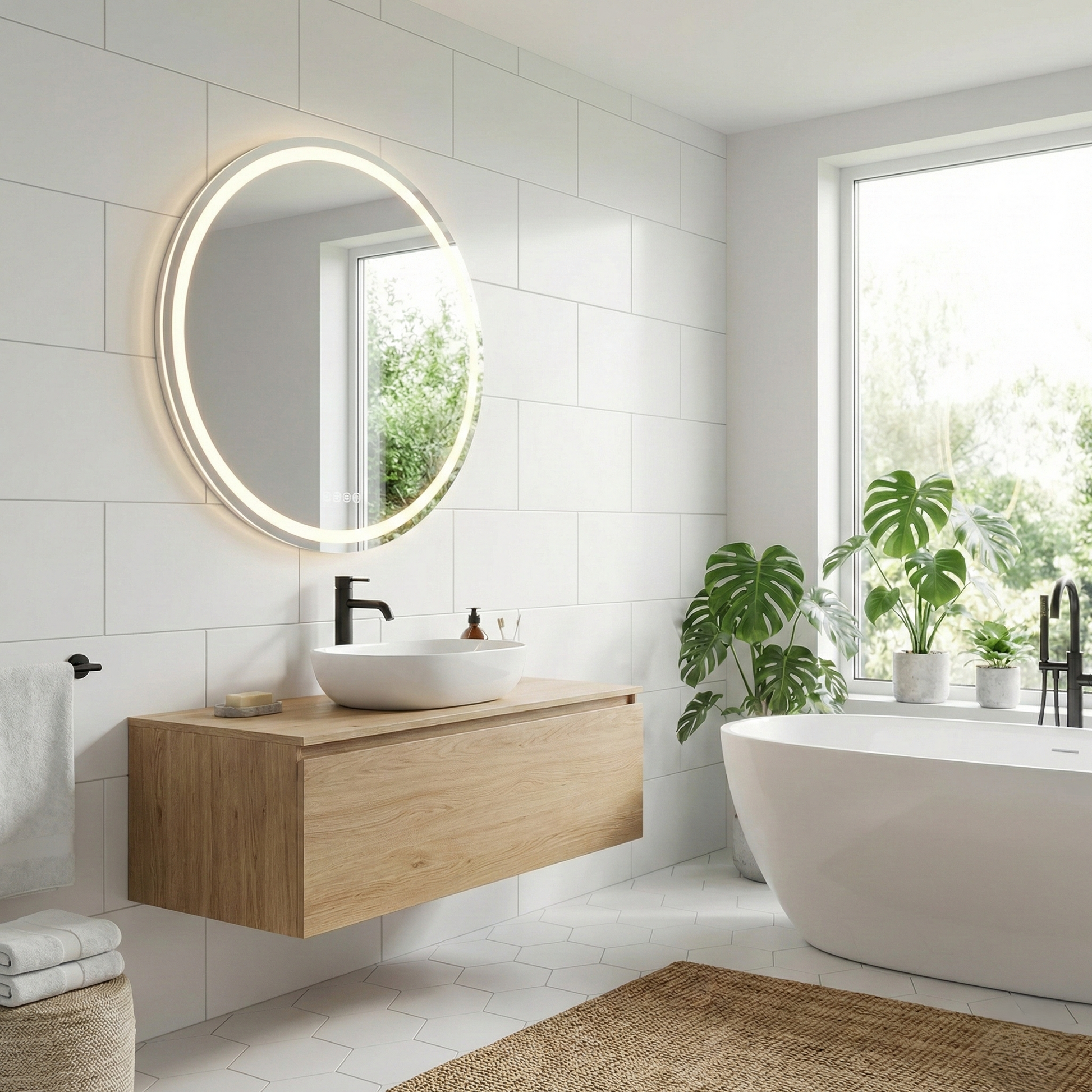 Oglinda LED Rotunda TOSCARIA Ø90cm este alegerea ideala pentru bai moderne, minimaliste si premium, unde designul curat se imbina perfect cu functii inteligente. Realizata din oglinda argintie fara cupru, cu o grosime de 5 mm, aceasta ofera o claritate excelenta, rezistenta mai buna in timp si un aspect impecabil.
