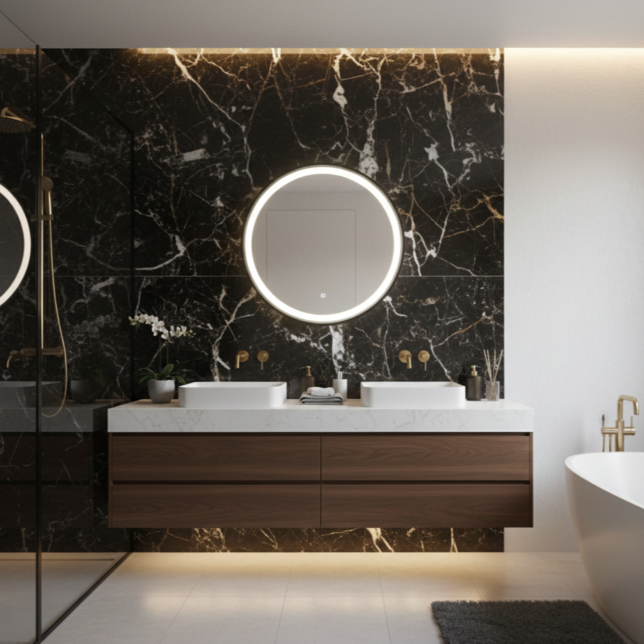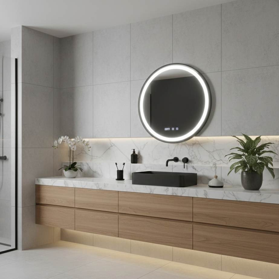 Novara Compact Black demonstrează că eleganța și tehnologia pot fi concentrate într-un design ergonomic. Cu un diametru de 50 cm, această oglindă rotundă este piesa perfectă pentru a aduce un plus de modernitate în spațiile restrânse, fără a face compromisuri la capitolul funcționalitate. Rama neagră mată îi oferă un contur precis, transformând-o într-un obiect de decor sofisticat.