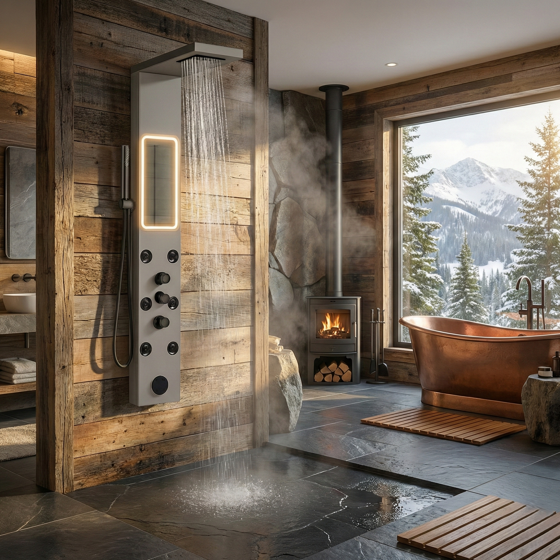 Panou de Dus Premium Silver ArcticFlow – Oglinda, Masaj, LED imbina designul modern cu functionalitati avansate, fiind ideal pentru bai elegante si bine echipate. Realizat din inox SUS304 cu grosime de 1 mm, panoul ofera rezistenta ridicata la coroziune si o constructie solida, potrivita pentru utilizare zilnica pe termen lung.