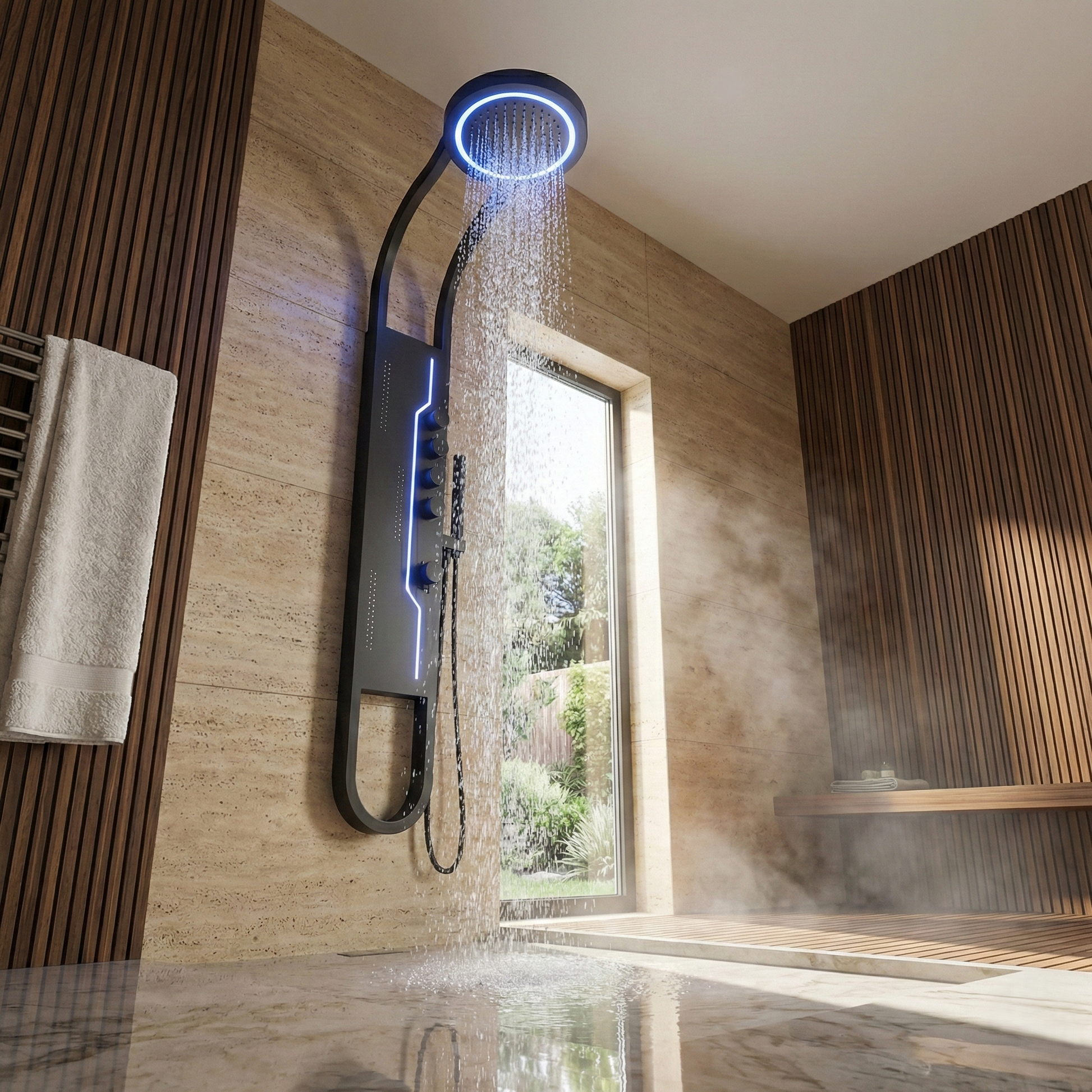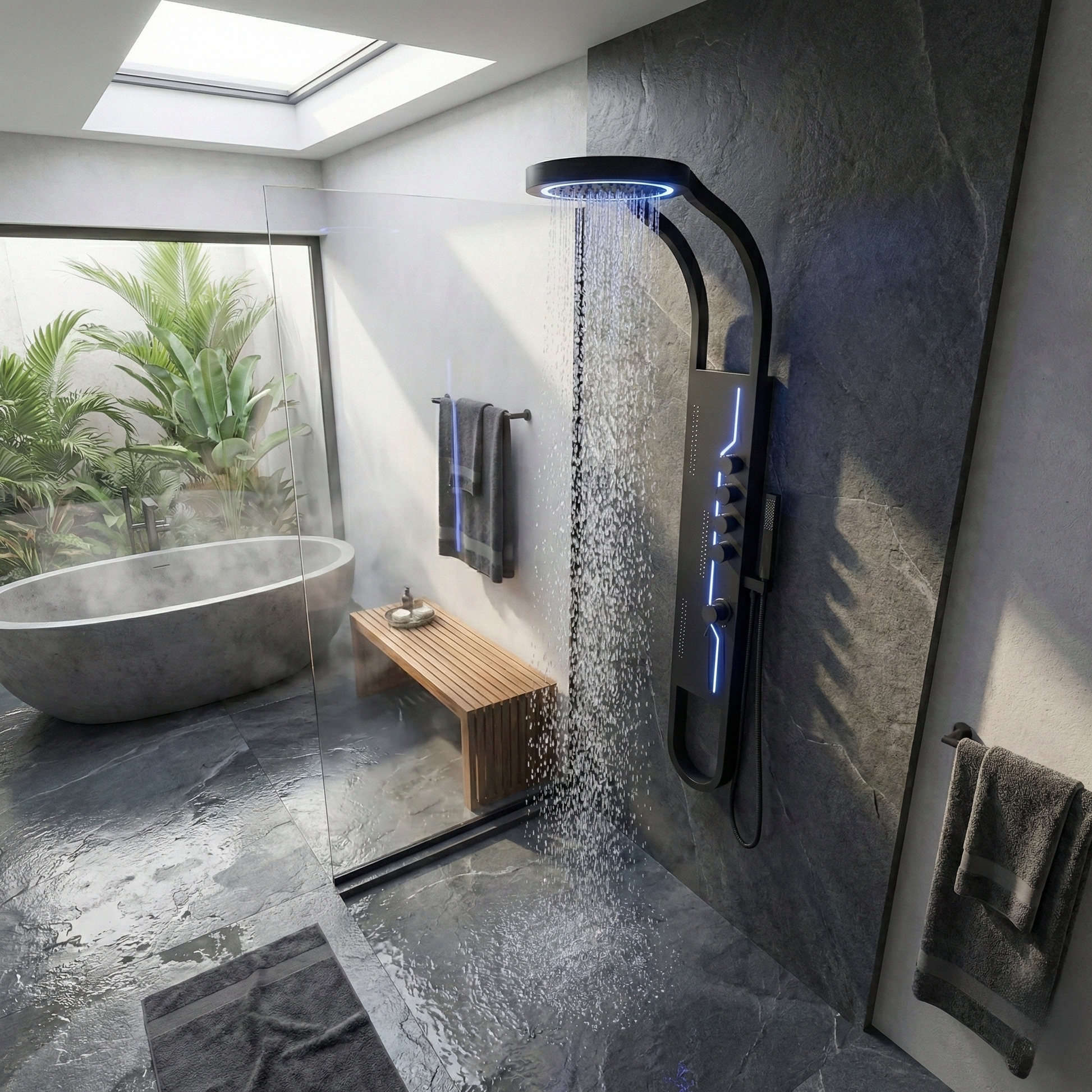 Panou de Dus Premium Black LunarFlow - LED, Masaj, 146CM este un model modern, cu design elegant in finisaj negru, creat pentru bai premium si pentru o experienta de dus tip SPA, direct la tine acasa. Constructia din inox SUS304 cu grosime de 1 mm ofera rezistenta ridicata la coroziune, stabilitate si durabilitate excelenta in timp.