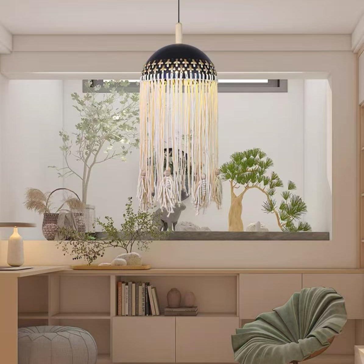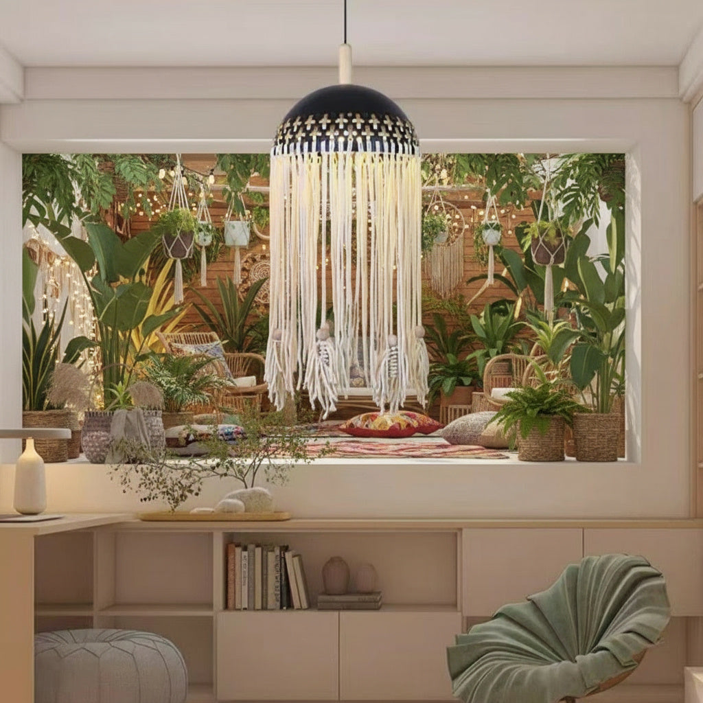 Pendulul în stil boho aduce un aer cald, natural și relaxant în orice interior, fiind o alegere ideală pentru spațiile amenajate cu atenție la detalii și echilibru vizual. Designul său decorativ, cu franjuri atent lucrate, creează un efect vizual plăcut și o lumină difuză, care contribuie la o atmosferă primitoare și armonioasă.