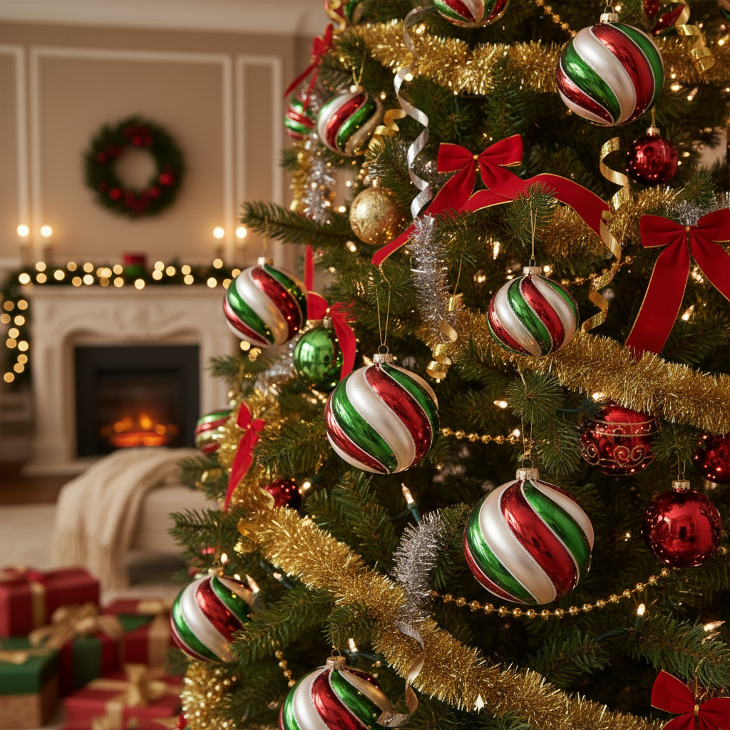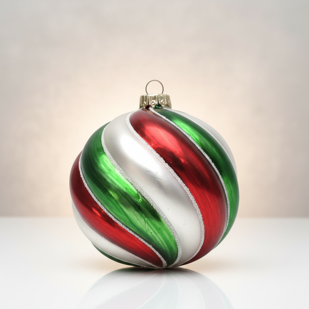 Adauga o nota eleganta si festiva decorului de sarbatori cu acest set de 6 globuri de Craciun, decorate in nuante clasice de rosu, verde si alb. Fiecare glob este realizat cu un design spiralat lucios, accentuat de linii fine cu efect sclipitor, oferind un aspect sofisticat si modern.