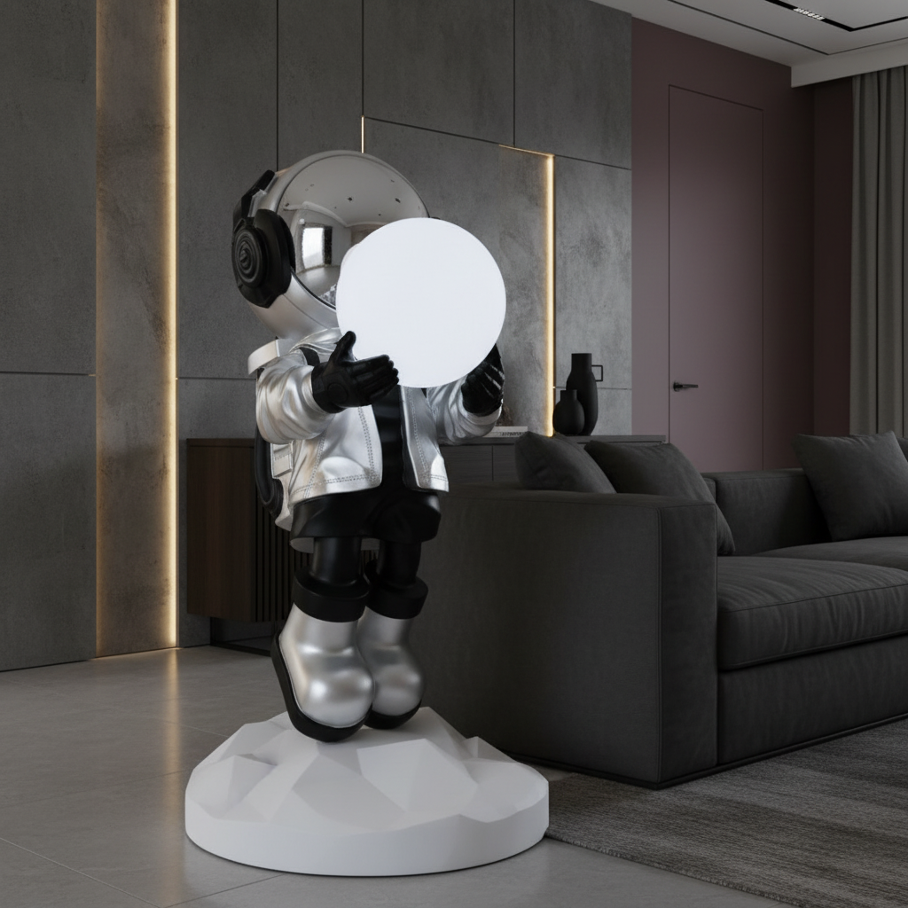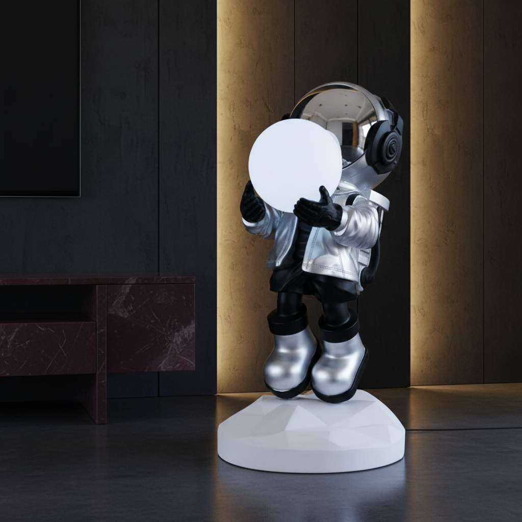 Statueta decorativa Astronaut transforma orice spatiu intr-un punct de atractie vizuala, combinand designul futurist cu iluminarea RGB interactiva. Globul luminos controlat prin atingere creeaza o atmosfera dinamica si moderna, iar functionarea pe acumulator permite amplasarea libera, fara cabluri vizibile.