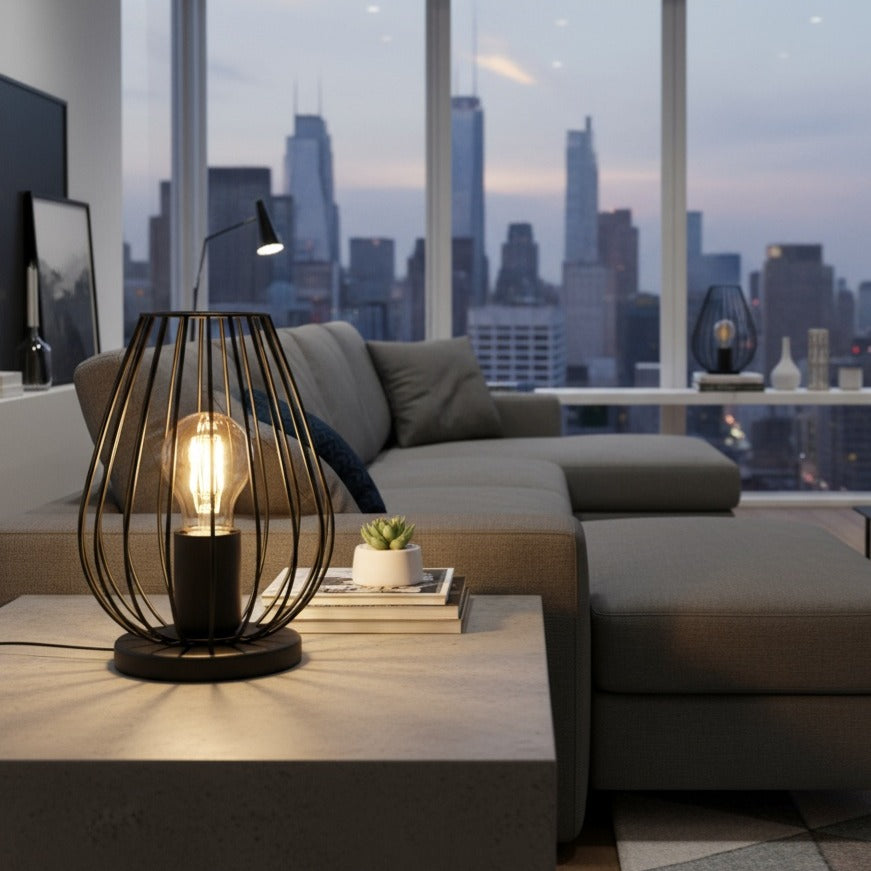 Lampa de masă NEWTOWN are un abajur oval din sârmă metalică neagră, combinat cu o bază rotundă din metal negru. Structura tip plasă creează un joc fascinant de lumini și umbre atunci când lampa este aprinsă.